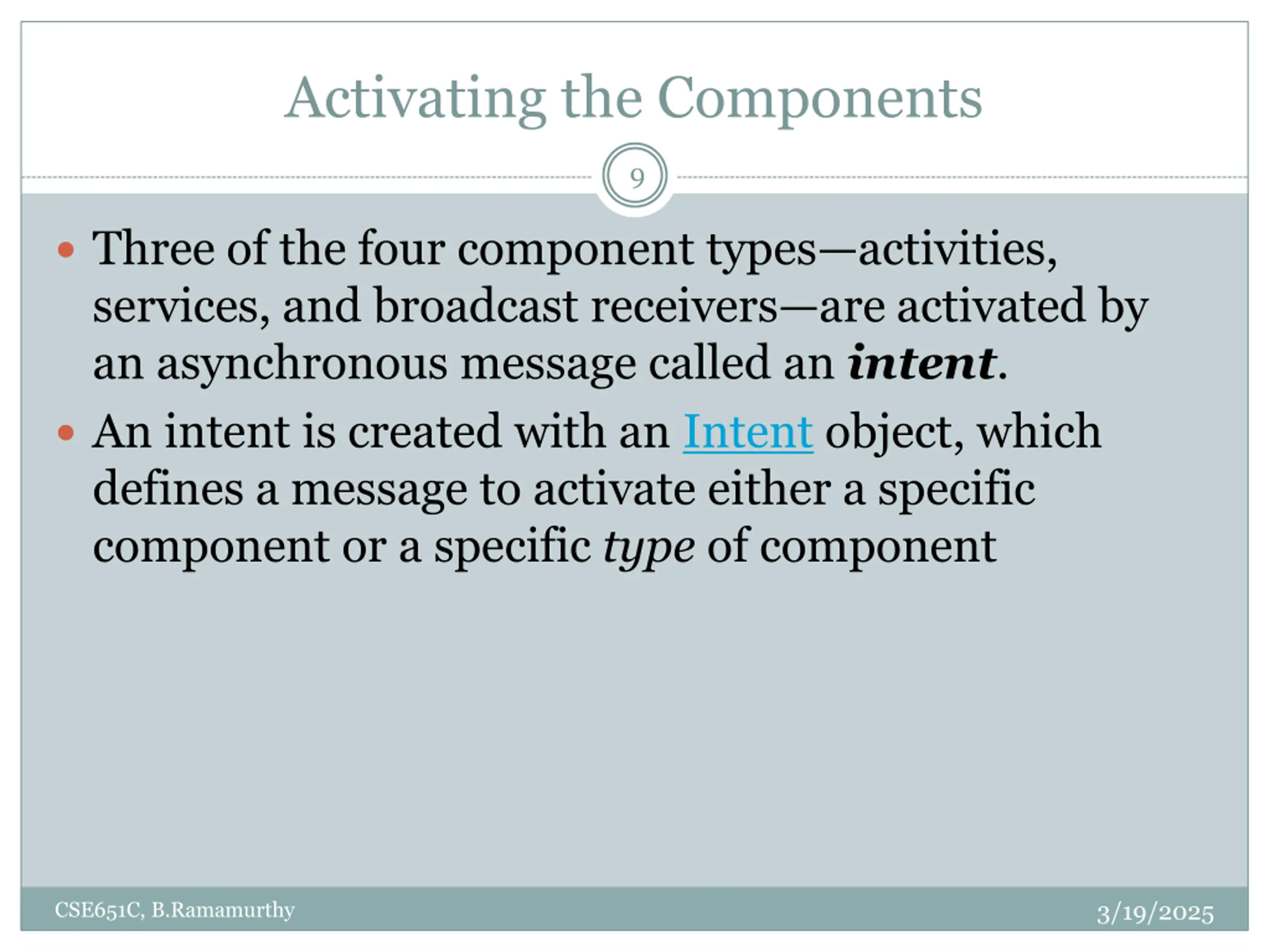 Activating the Components 9 Three of the four component types activities, services, and broadcast receivers are activated by an asynchronous message called an intent. An intent is created with an Intent object, which defines a message to activate either a specific component or a specific type of component 3/19/2025 CSE651C, B.Ramamurthy