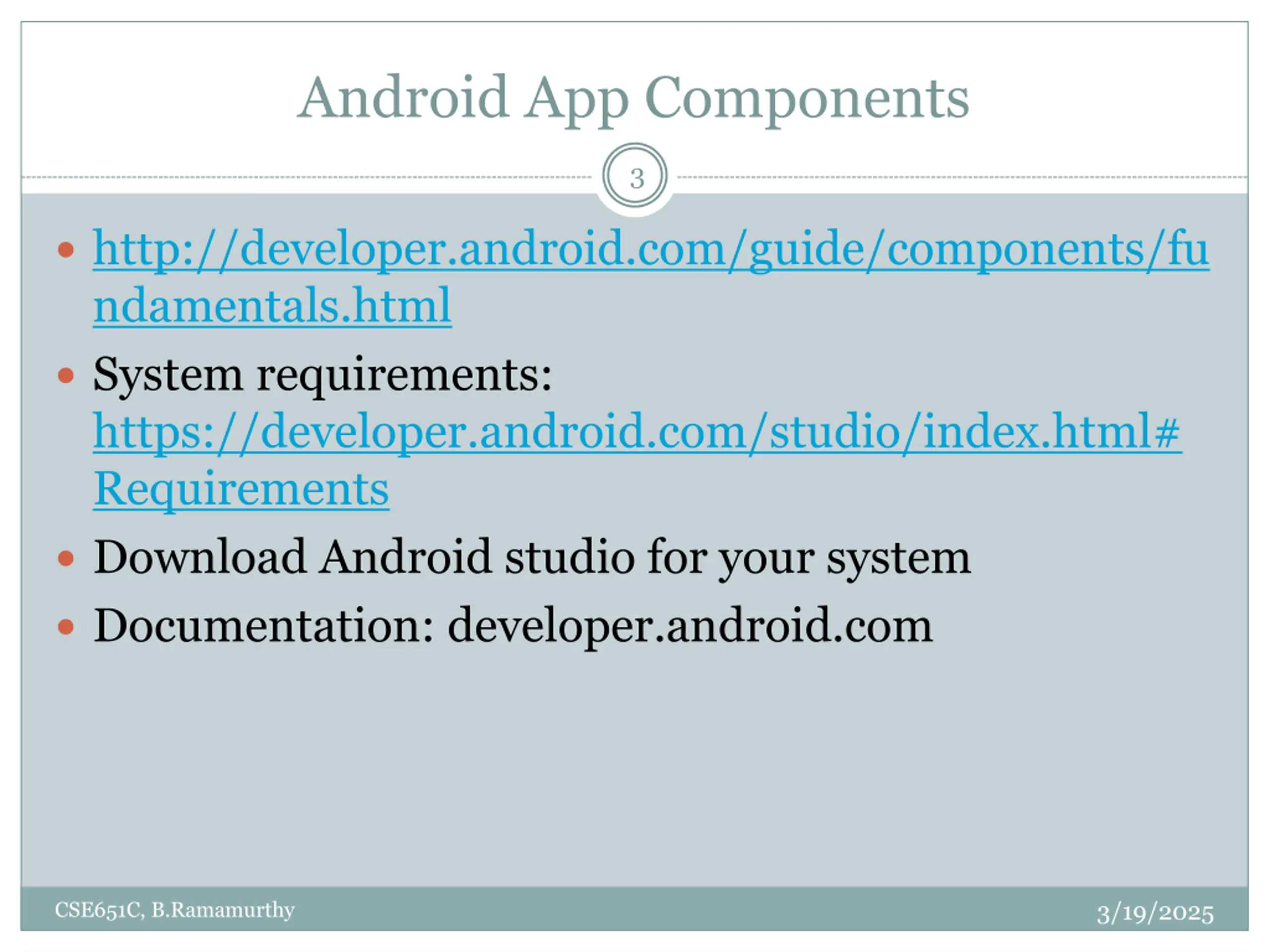 Android App Components 3 http://developer.android.com/guide/components/fu ndamentals.html System requirements: https://developer.android.com/studio/index.html# Requirements Download Android studio for your system Documentation: developer.android.com 3/19/2025 CSE651C, B.Ramamurthy