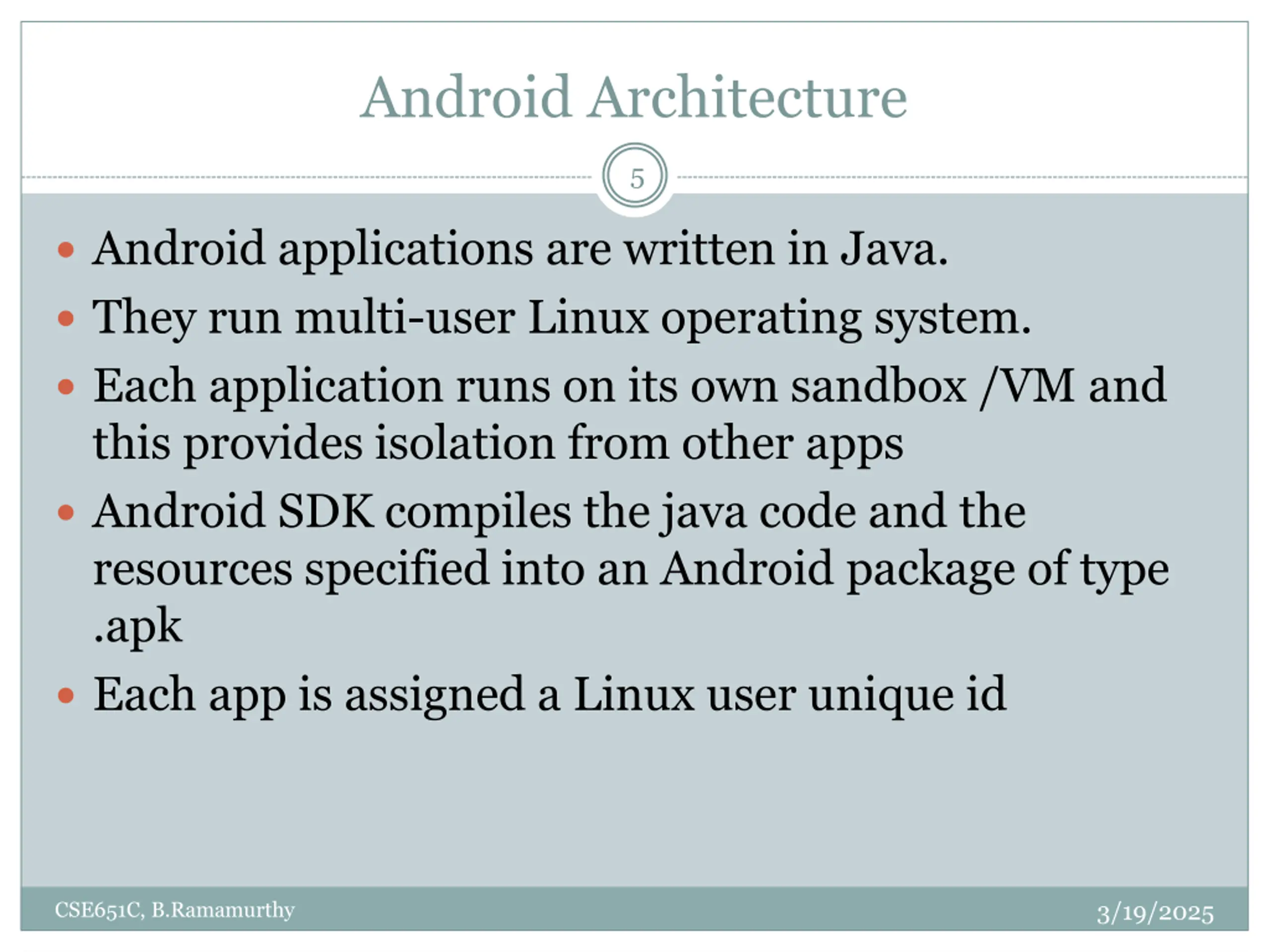 Android Architecture 5 Android applications are written in Java. They run multi-user Linux operating system. Each application runs on its own sandbox /VM and this provides isolation from other apps Android SDK compiles the java code and the resources specified into an Android package of type .apk Each app is assigned a Linux user unique id 3/19/2025 CSE651C, B.Ramamurthy