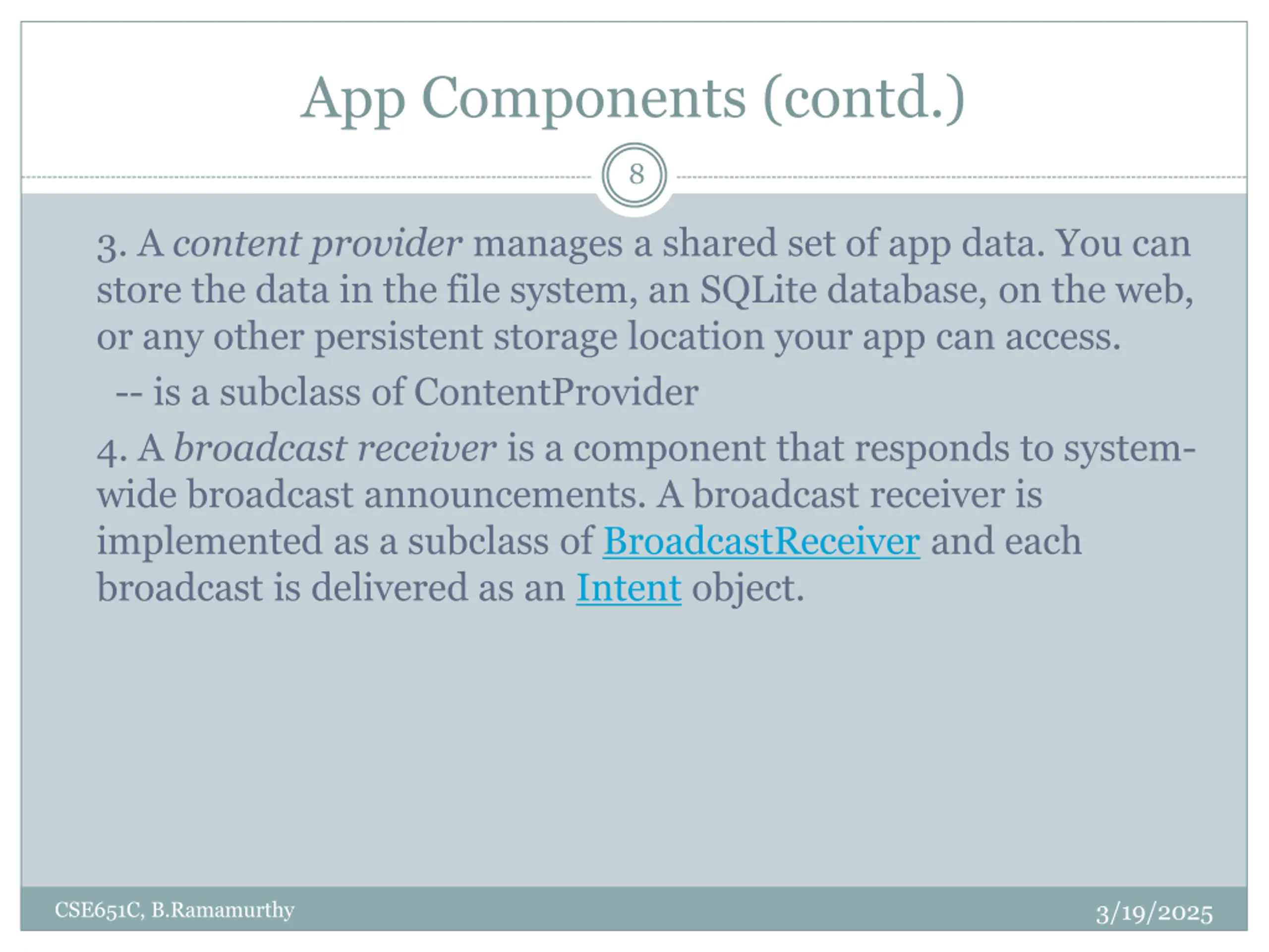 App Components (contd.) 8 3. A content provider manages a shared set of app data. You can store the data in the file system, an SQLite database, on the web, or any other persistent storage location your app can access. -- is a subclass of ContentProvider 4. A broadcast receiver is a component that responds to system- wide broadcast announcements. A broadcast receiver is implemented as a subclass of BroadcastReceiver and each broadcast is delivered as an Intent object. 3/19/2025 CSE651C, B.Ramamurthy