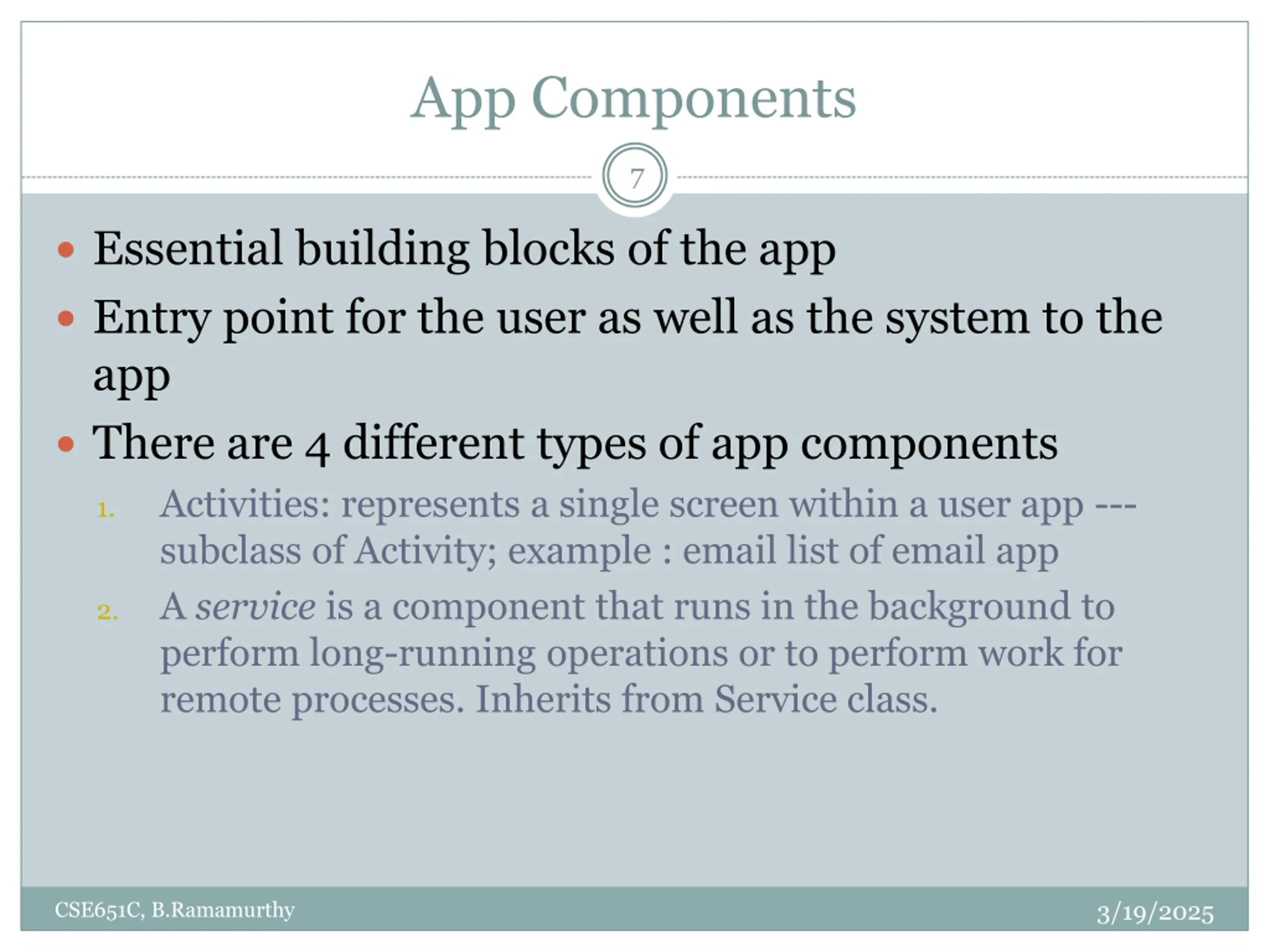 App Components 7 Essential building blocks of the app Entry point for the user as well as the system to the app There are 4 different types of app components Activities: represents a single screen within a user app --- subclass of Activity; example : email list of email app A service is a component that runs in the background to perform long-running operations or to perform work for remote processes. Inherits from Service class. 1. 2. 3/19/2025 CSE651C, B.Ramamurthy
