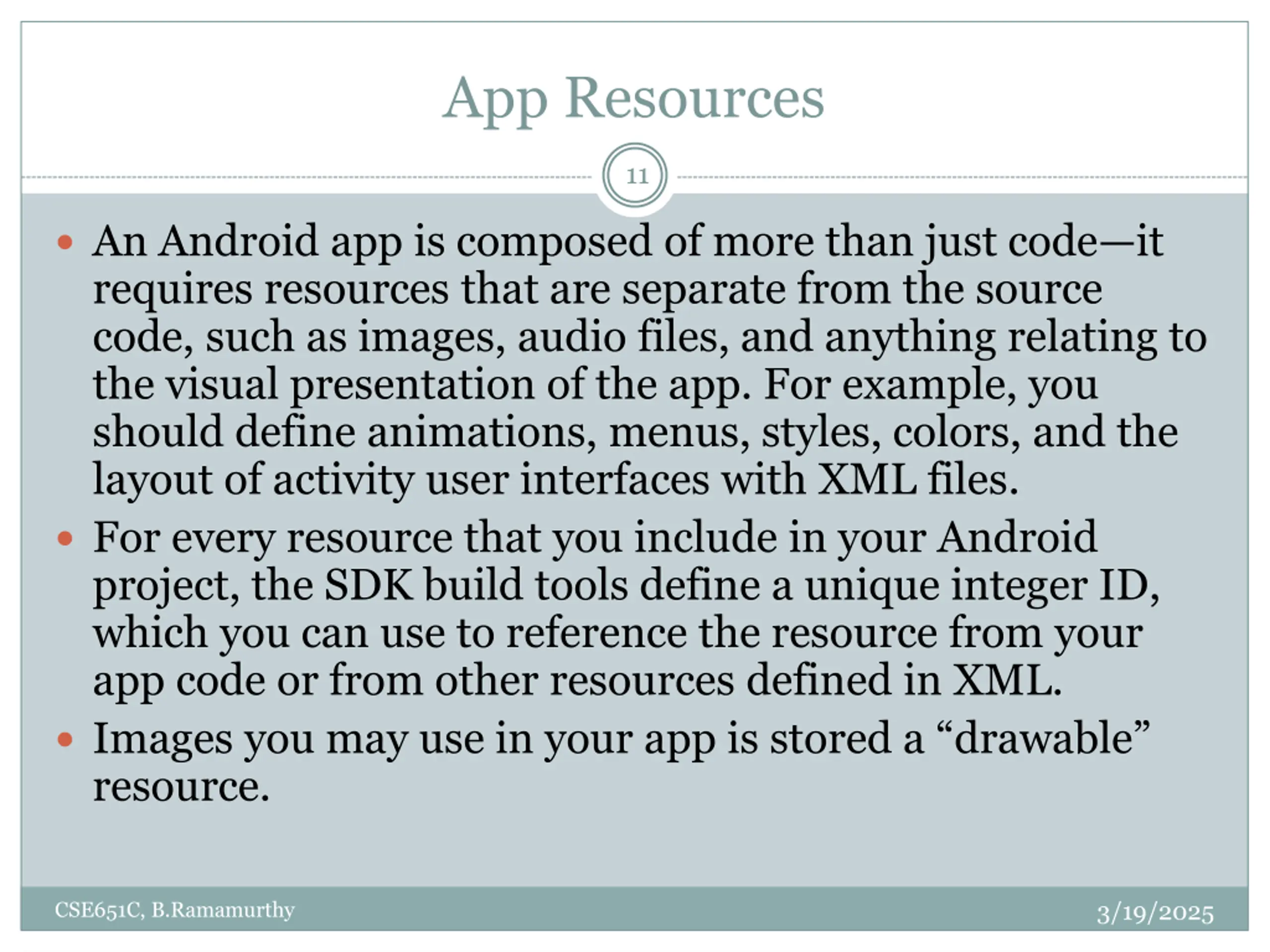 App Resources 11 An Android app is composed of more than just code it requires resources that are separate from the source code, such as images, audio files, and anything relating to the visual presentation of the app. For example, you should define animations, menus, styles, colors, and the layout of activity user interfaces with XML files. For every resource that you include in your Android project, the SDK build tools define a unique integer ID, which you can use to reference the resource from your app code or from other resources defined in XML. Images you may use in your app is stored a drawable resource. 3/19/2025 CSE651C, B.Ramamurthy