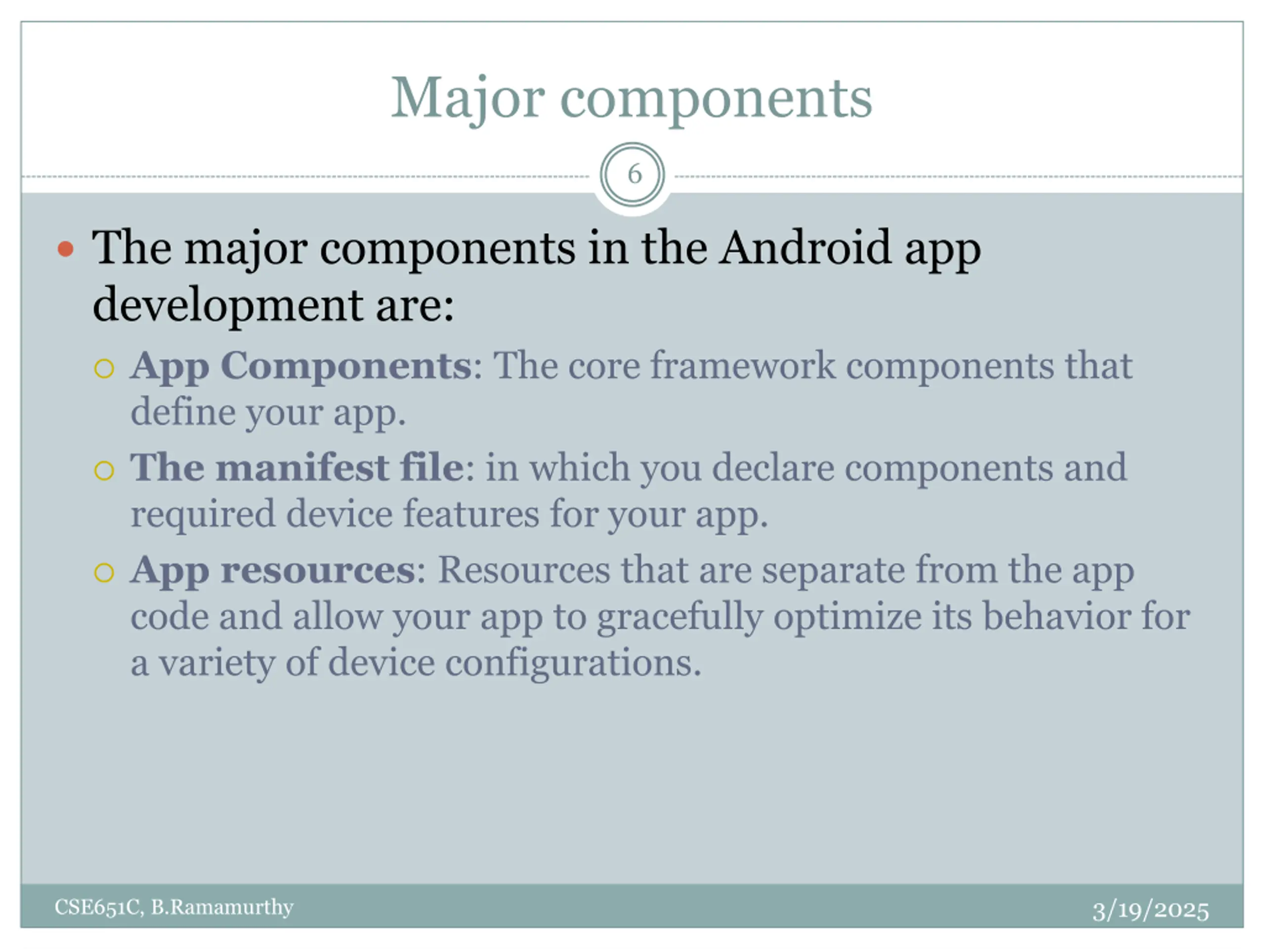 Major components 6 The major components in the Android app development are: App Components: The core framework components that define your app. The manifest file: in which you declare components and required device features for your app. App resources: Resources that are separate from the app code and allow your app to gracefully optimize its behavior for a variety of device configurations. 3/19/2025 CSE651C, B.Ramamurthy