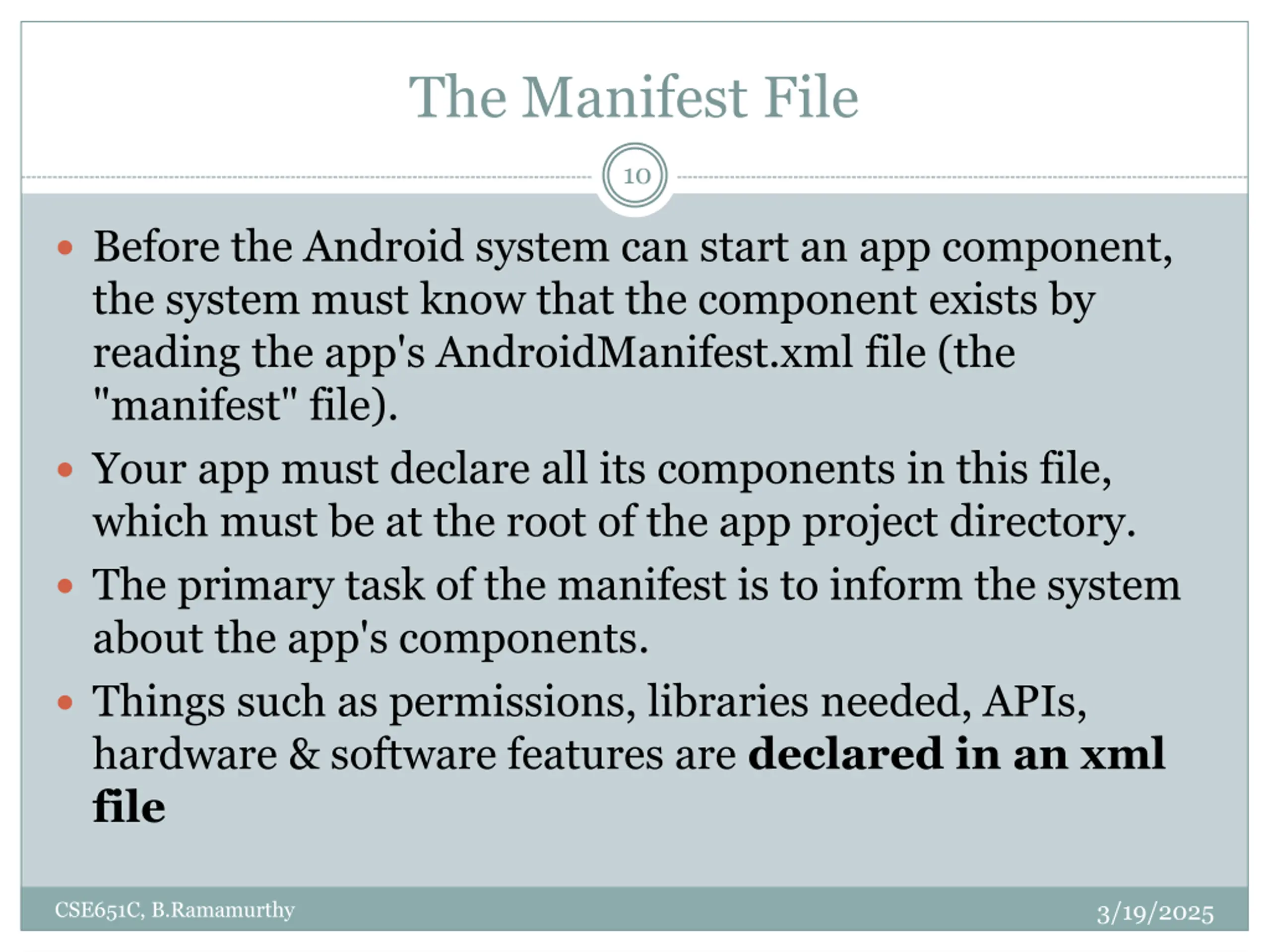 The Manifest File 10 Before the Android system can start an app component, the system must know that the component exists by reading the app's AndroidManifest.xml file (the "manifest" file). Your app must declare all its components in this file, which must be at the root of the app project directory. The primary task of the manifest is to inform the system about the app's components. Things such as permissions, libraries needed, APIs, hardware & software features are declared in an xml file 3/19/2025 CSE651C, B.Ramamurthy