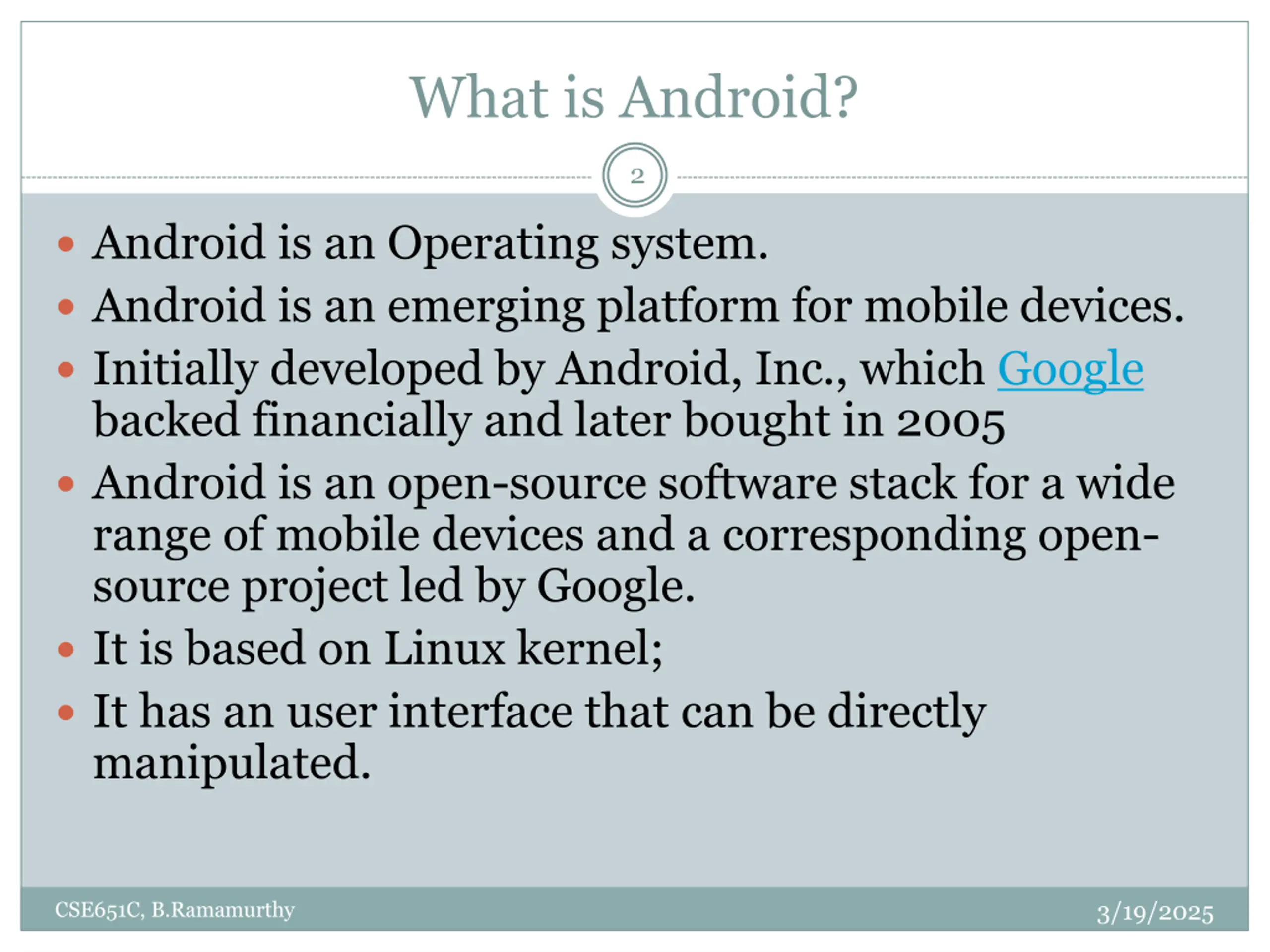 What is Android? 2 Android is an Operating system. Android is an emerging platform for mobile devices. Initially developed by Android, Inc., which Google backed financially and later bought in 2005 Android is an open-source software stack for a wide range of mobile devices and a corresponding open- source project led by Google. It is based on Linux kernel; It has an user interface that can be directly manipulated. 3/19/2025 CSE651C, B.Ramamurthy