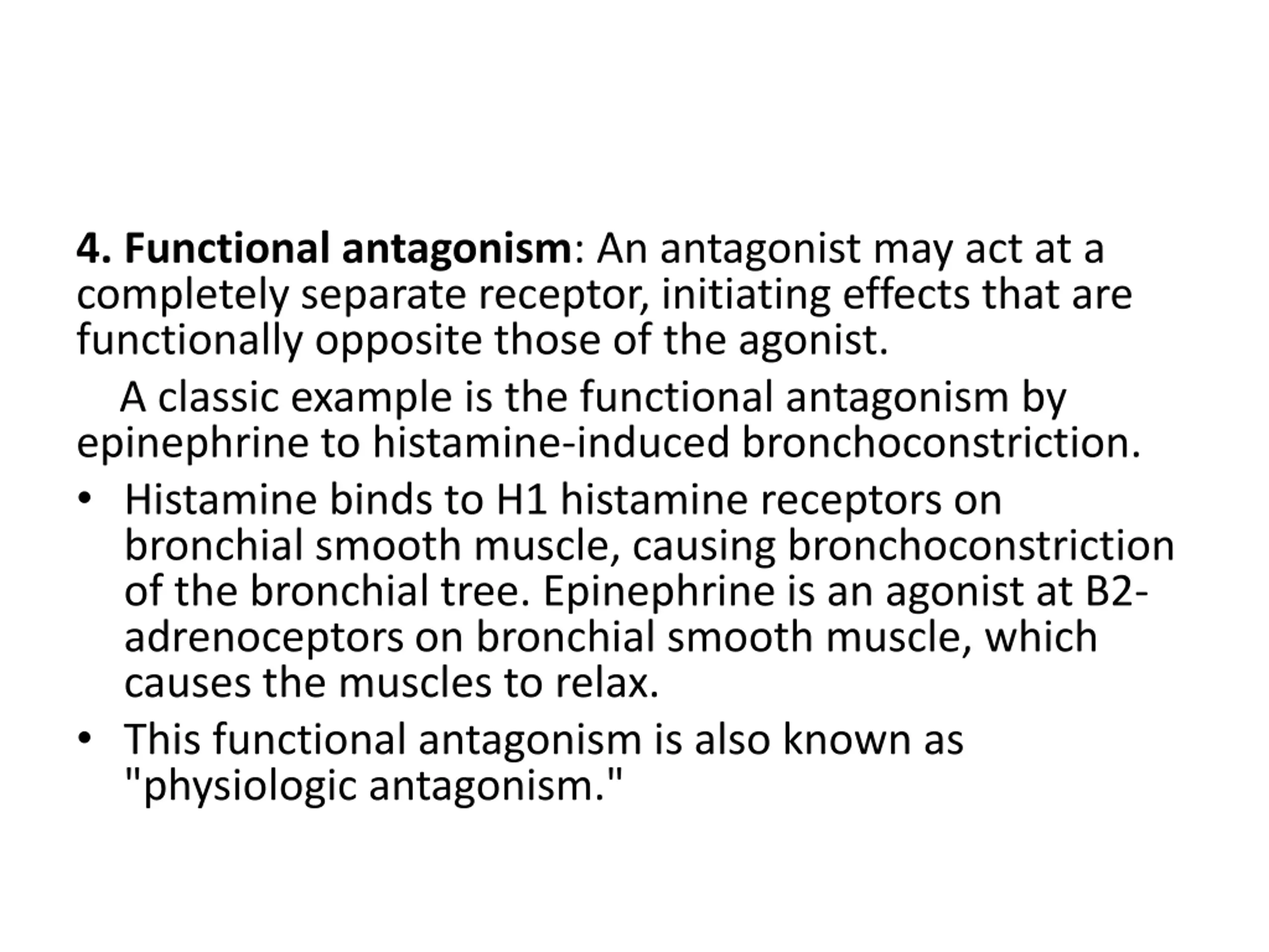 4. Functional antagonism: An antagonist may act at a completely separate receptor, initiating effects that are functionally opposite those of the agonist. A classic example is the functional antagonism by epinephrine to histamine-induced bronchoconstriction. Histamine binds to H1 histamine receptors on bronchial smooth muscle, causing bronchoconstriction of the bronchial tree. Epinephrine is an agonist at B2- adrenoceptors on bronchial smooth muscle, which causes the muscles to relax. This functional antagonism is also known as "physiologic antagonism."