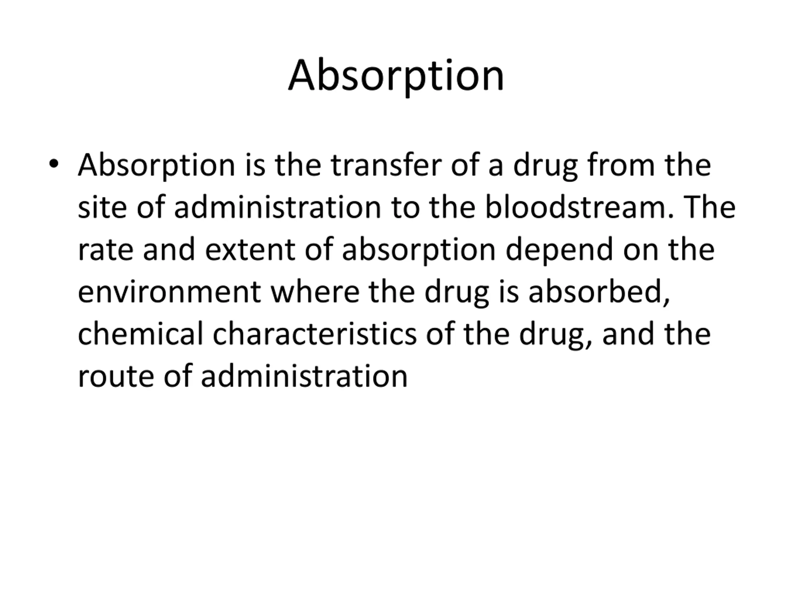 Absorption Absorption is the transfer of a drug from the site of administration to the bloodstream. The rate and extent of absorption depend on the environment where the drug is absorbed, chemical characteristics of the drug, and the route of administration