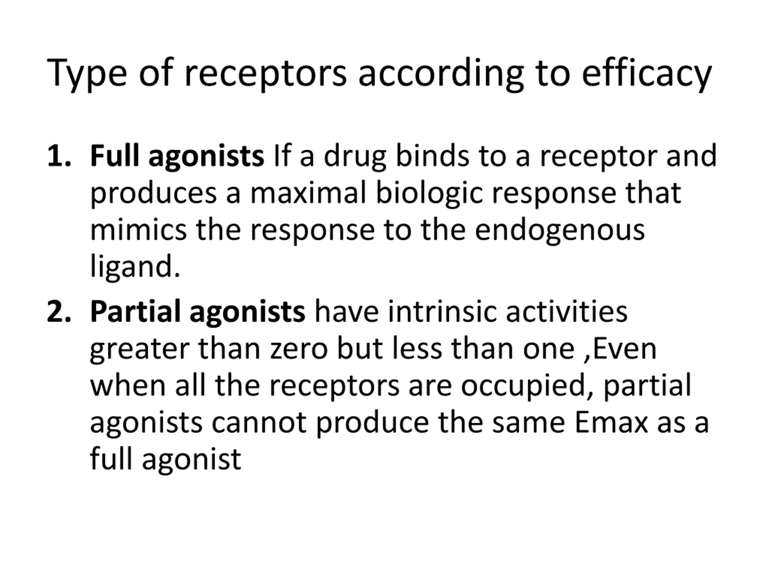 Type of receptors according to efficacy 1. Full agonists If a drug binds to a receptor and produces a maximal biologic response that mimics the response to the endogenous ligand. 2. Partial agonists have intrinsic activities greater than zero but less than one ,Even when all the receptors are occupied, partial agonists cannot produce the same Emax as a full agonist