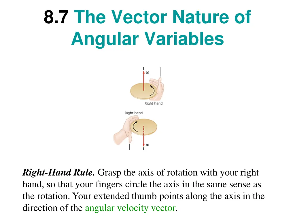 8.7 The Vector Nature of Angular Variables Right-Hand Rule. Grasp the axis of rotation with your right hand, so that your fingers circle the axis in the same sense as the rotation. Your extended thumb points along the axis in the direction of the angular velocity vector.