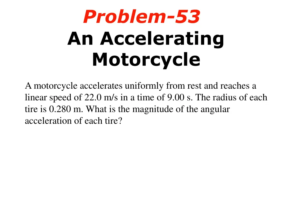 Problem-53 An Accelerating Motorcycle A motorcycle accelerates uniformly from rest and reaches a linear speed of 22.0 m/s in a time of 9.00 s. The radius of each tire is 0.280 m. What is the magnitude of the angular acceleration of each tire?