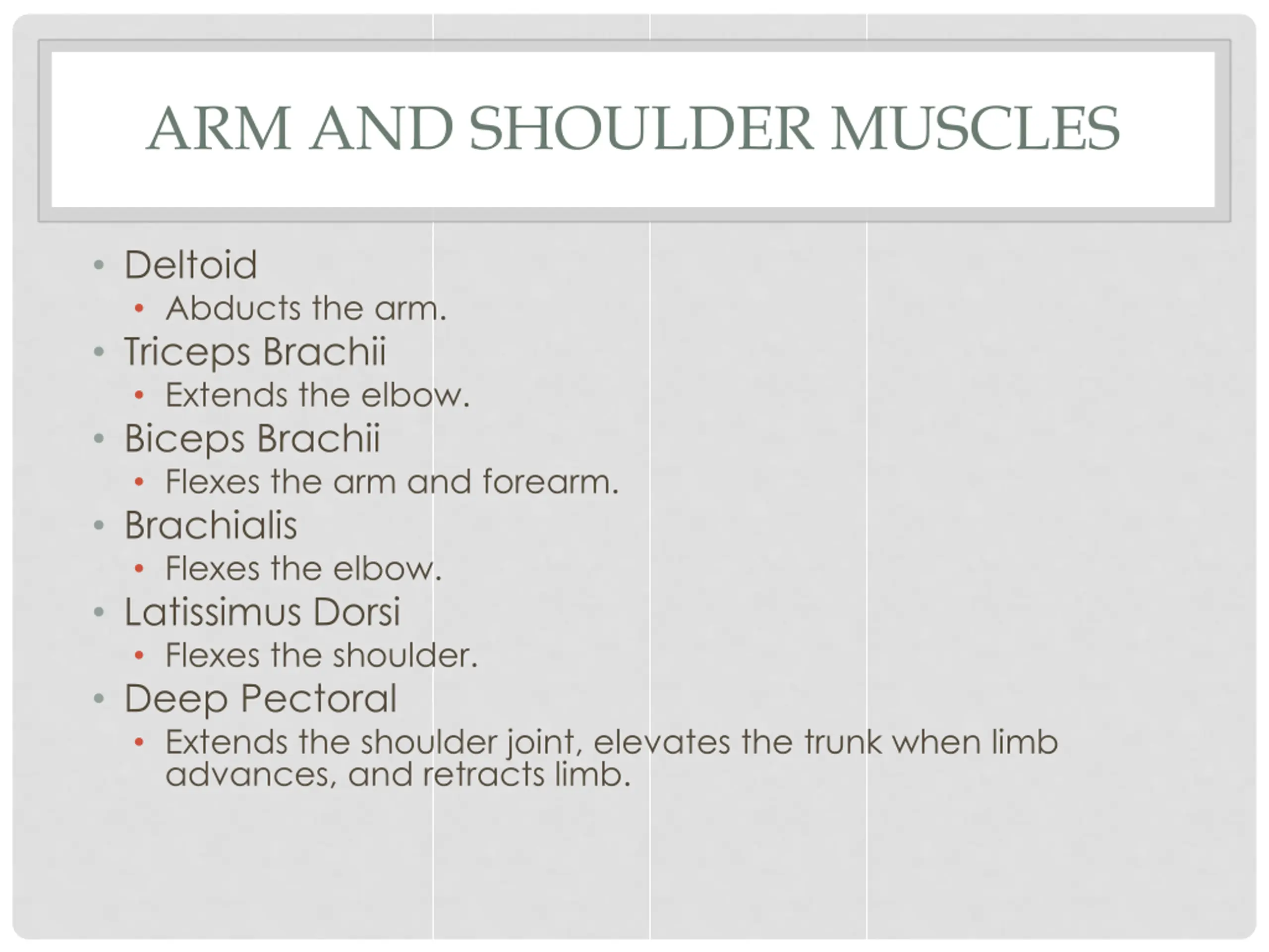 ARM AND SHOULDER MUSCLES Deltoid Abducts the arm. Triceps Brachii Extends the elbow. Biceps Brachii Flexes the arm and forearm. Brachialis Flexes the elbow. Latissimus Dorsi Flexes the shoulder. Deep Pectoral Extends the shoulder joint, elevates the trunk when limb advances, and retracts limb.