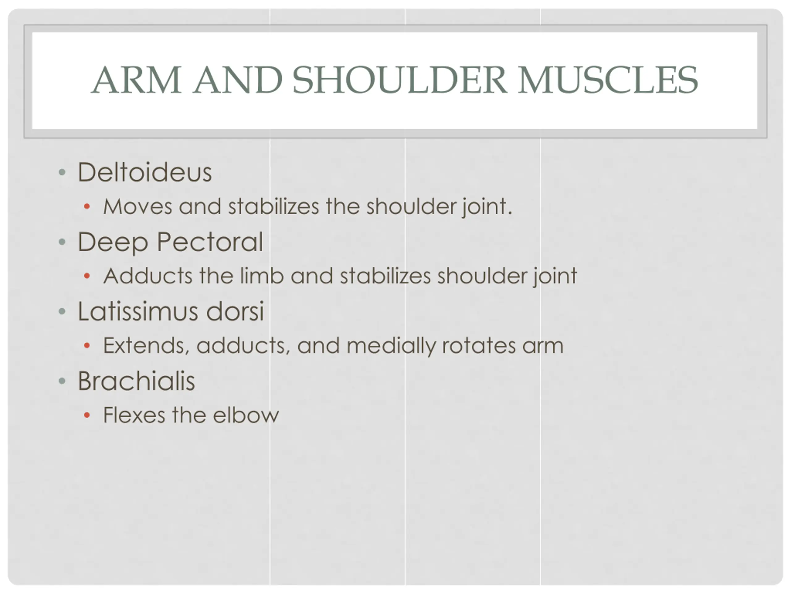 ARM AND SHOULDER MUSCLES Deltoideus Moves and stabilizes the shoulder joint. Deep Pectoral Adducts the limb and stabilizes shoulder joint Latissimus dorsi Extends, adducts, and medially rotates arm Brachialis Flexes the elbow