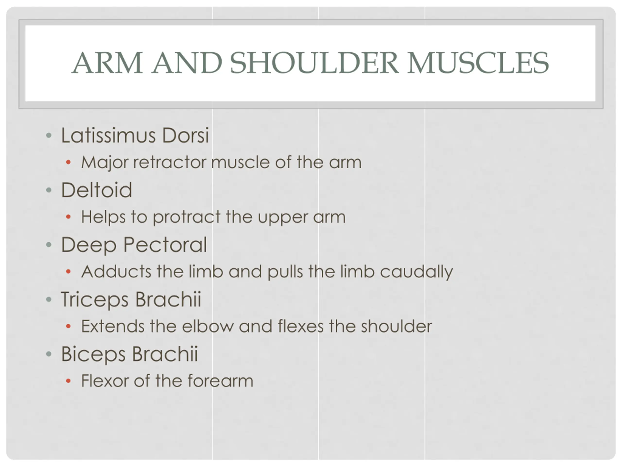 ARM AND SHOULDER MUSCLES Latissimus Dorsi Major retractor muscle of the arm Deltoid Helps to protract the upper arm Deep Pectoral Adducts the limb and pulls the limb caudally Triceps Brachii Extends the elbow and flexes the shoulder Biceps Brachii Flexor of the forearm