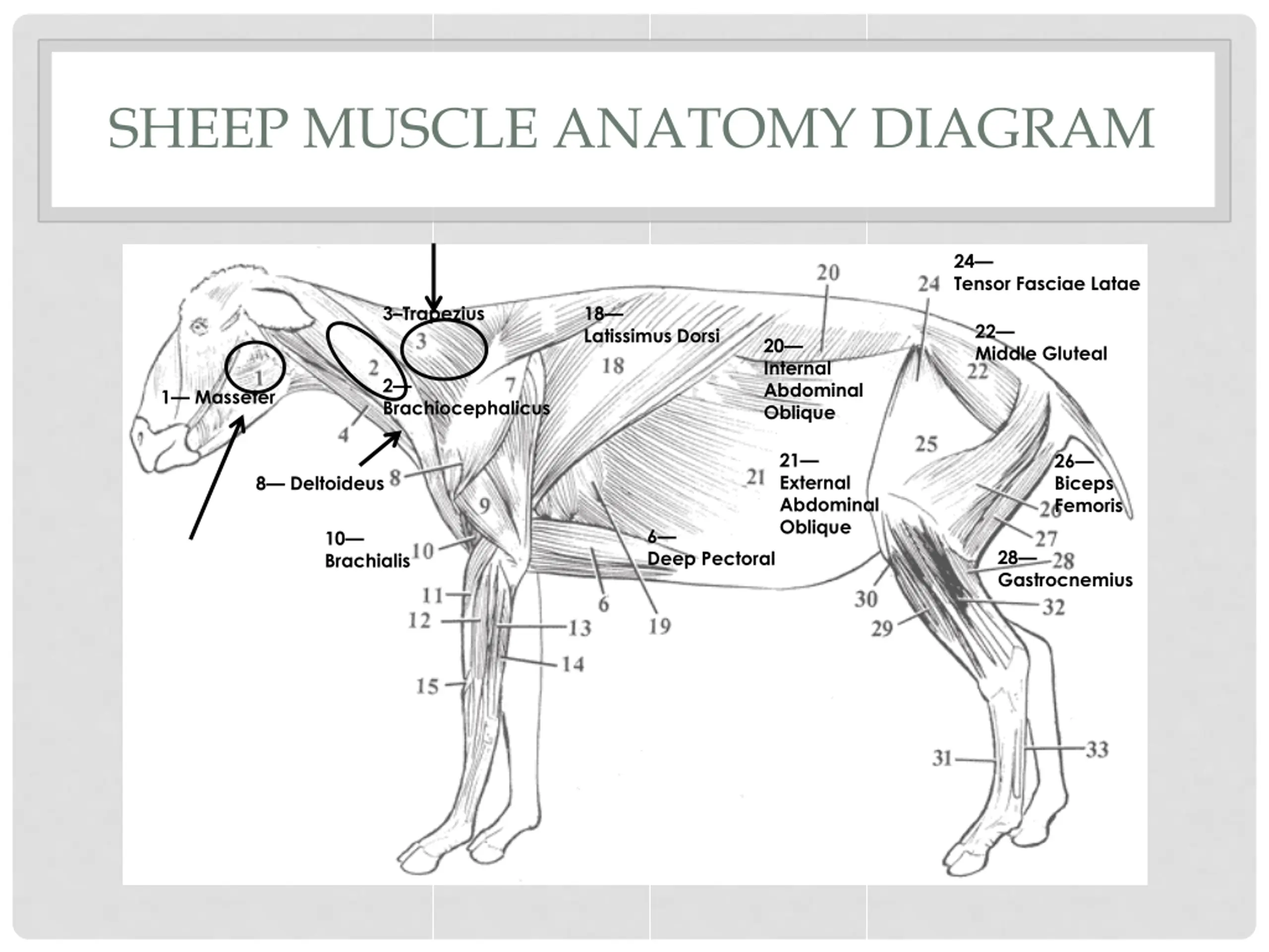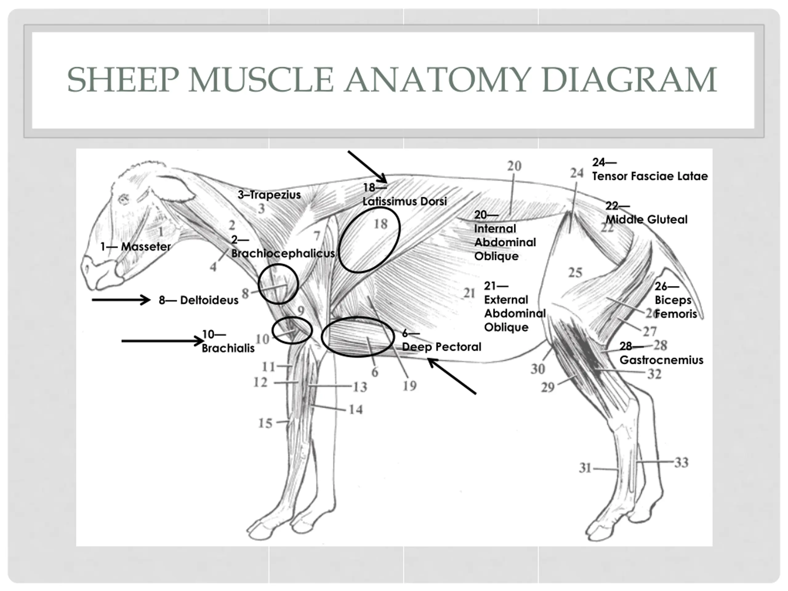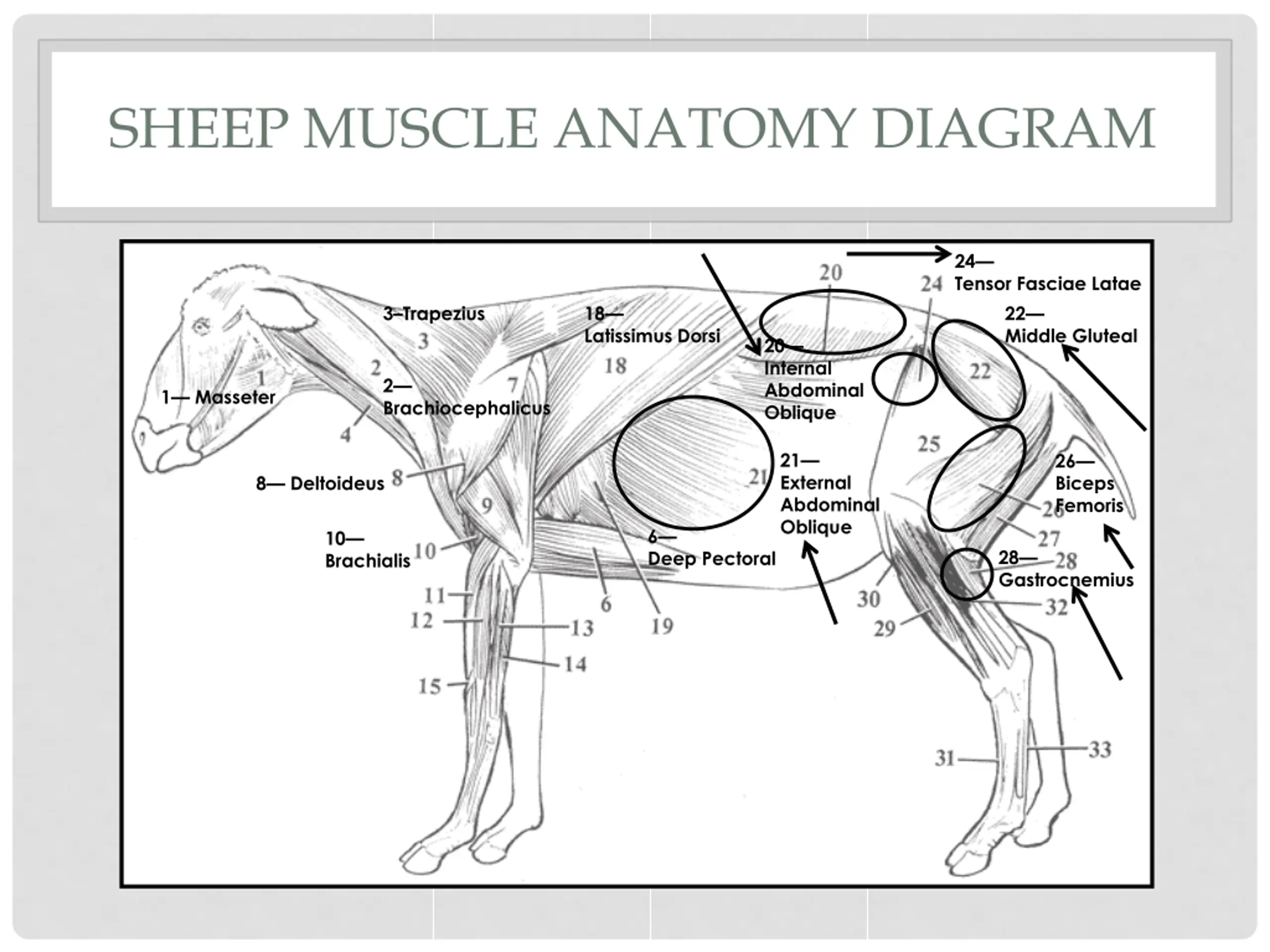 SHEEP MUSCLE ANATOMY DIAGRAM 24 Tensor Fasciae Latae 18 Latissimus Dorsi 3 Trapezius 22 Middle Gluteal 20 Internal Abdominal Oblique 2 Brachiocephalicus 1 Masseter 21 External Abdominal Oblique 26 Biceps Femoris 8 Deltoideus 6 Deep Pectoral 10 Brachialis 28 Gastrocnemius