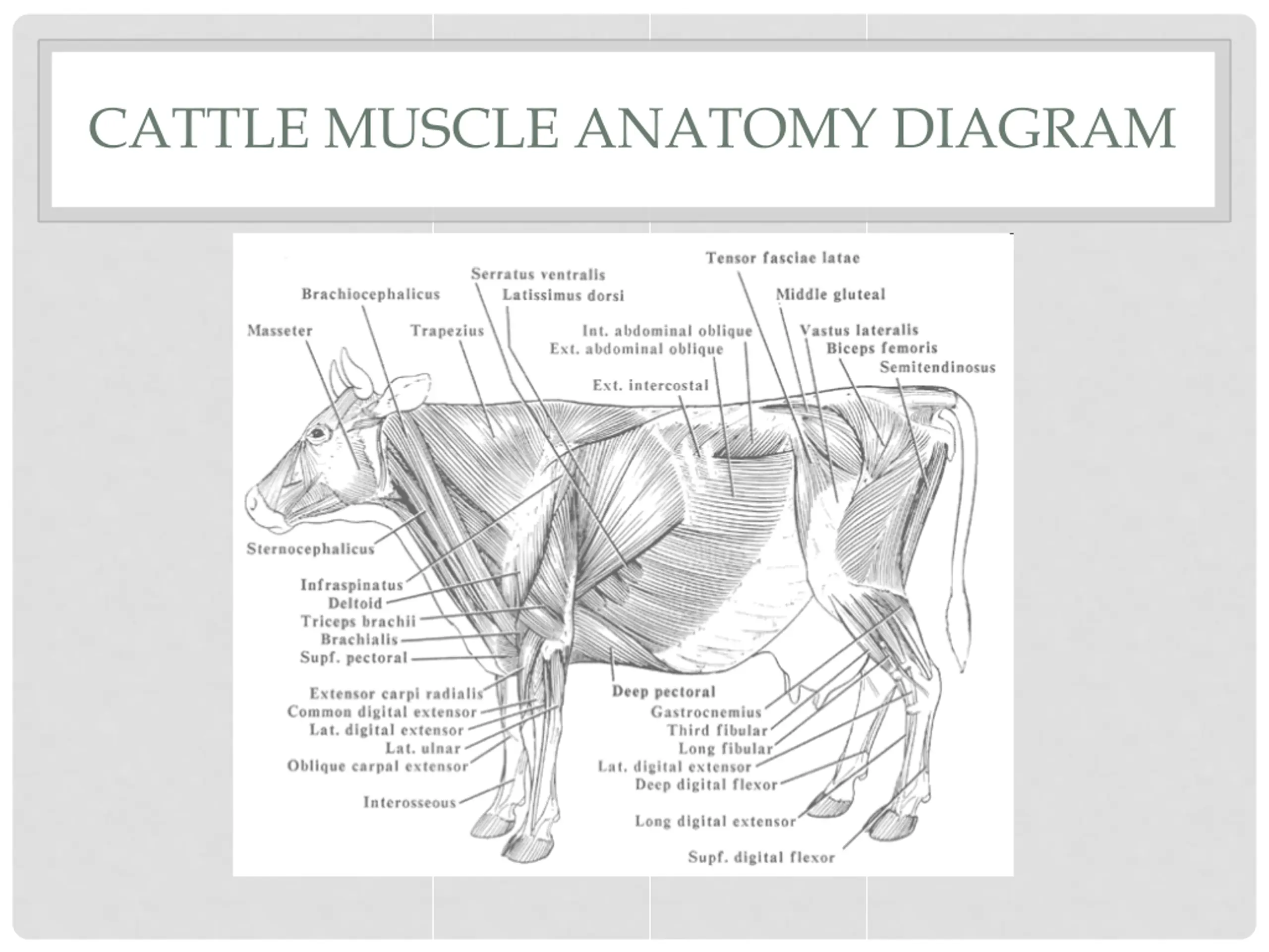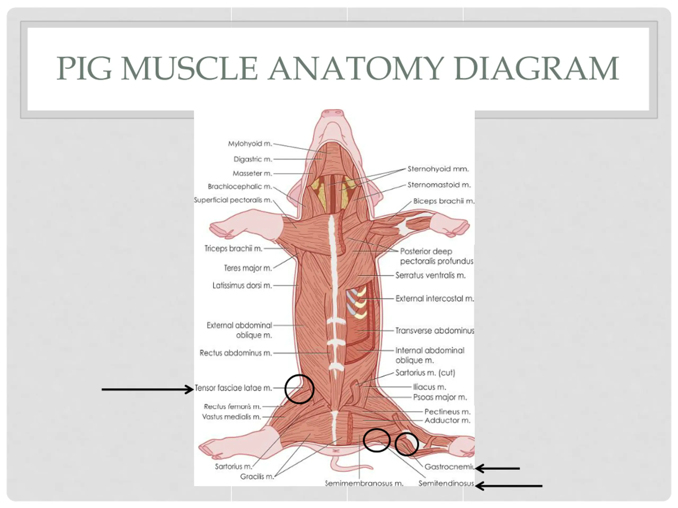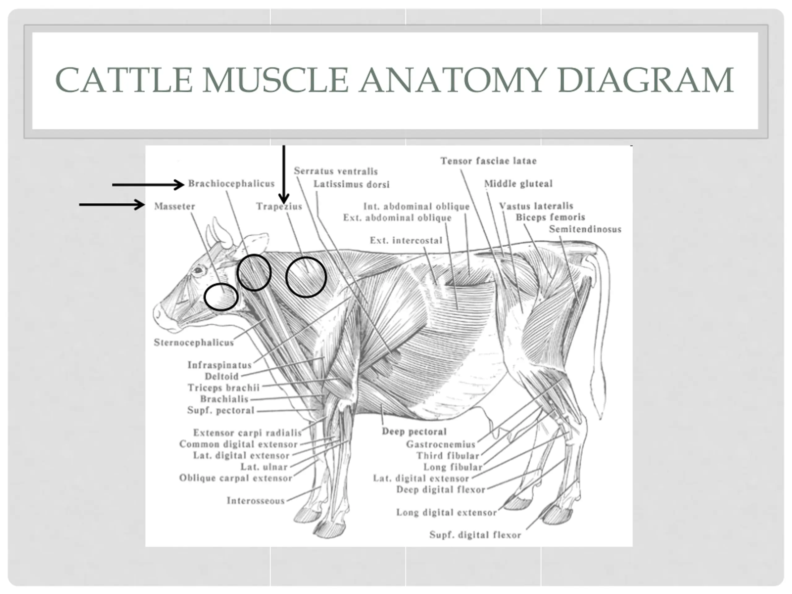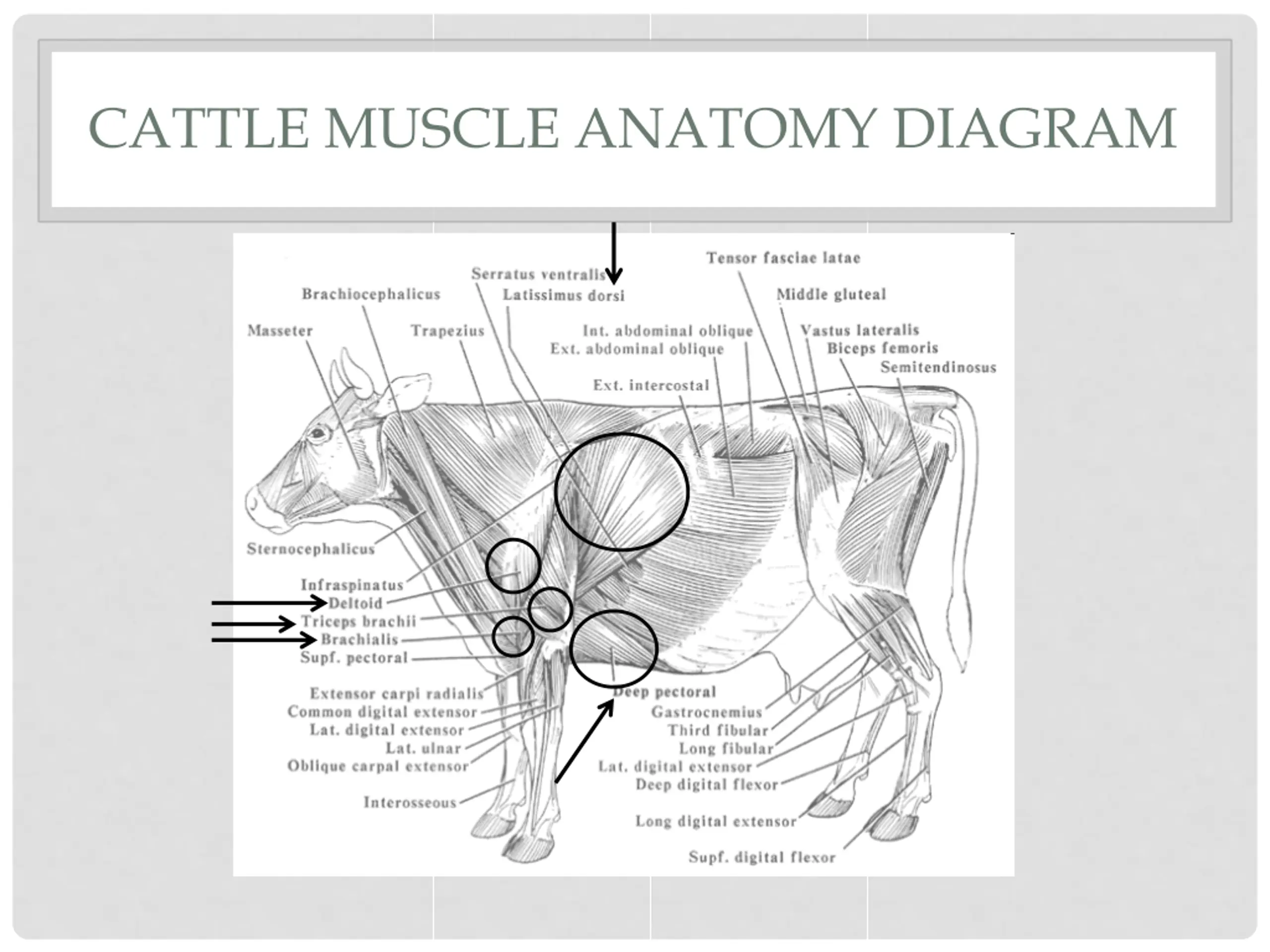 SHEEP MUSCLE ANATOMY DIAGRAM 24 Tensor Fasciae Latae 18 Latissimus Dorsi 3 Trapezius 22 Middle Gluteal 20 Internal Abdominal Oblique 2 Brachiocephalicus 1 Masseter 21 External Abdominal Oblique 26 Biceps Femoris 8 Deltoideus 6 Deep Pectoral 10 Brachialis 28 Gastrocnemius
