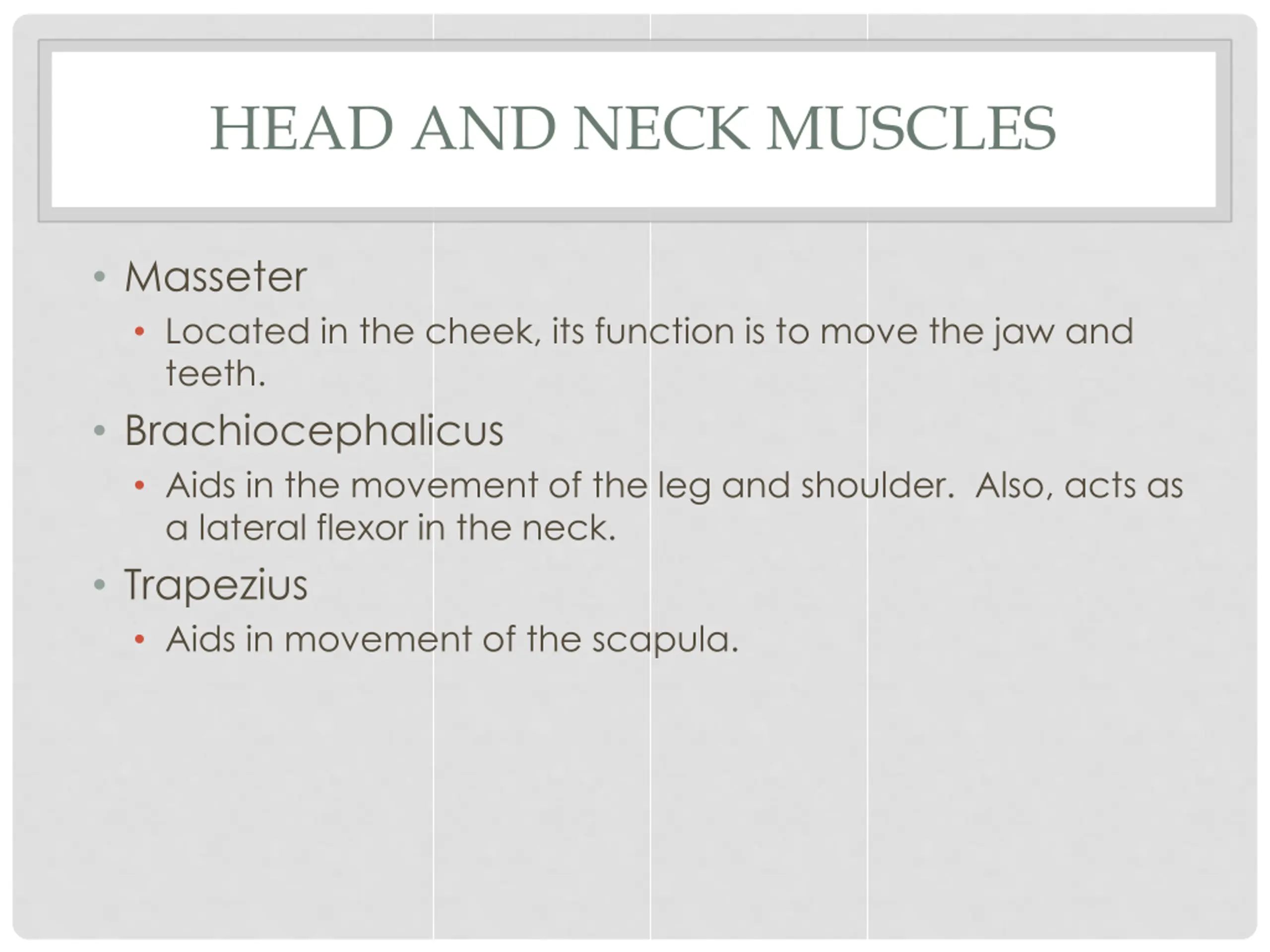 HEAD AND NECK MUSCLES Masseter Located in the cheek, its function is to move the jaw and teeth. Brachiocephalicus Aids in the movement of the leg and shoulder. Also, acts as a lateral flexor in the neck. Trapezius Aids in movement of the scapula.