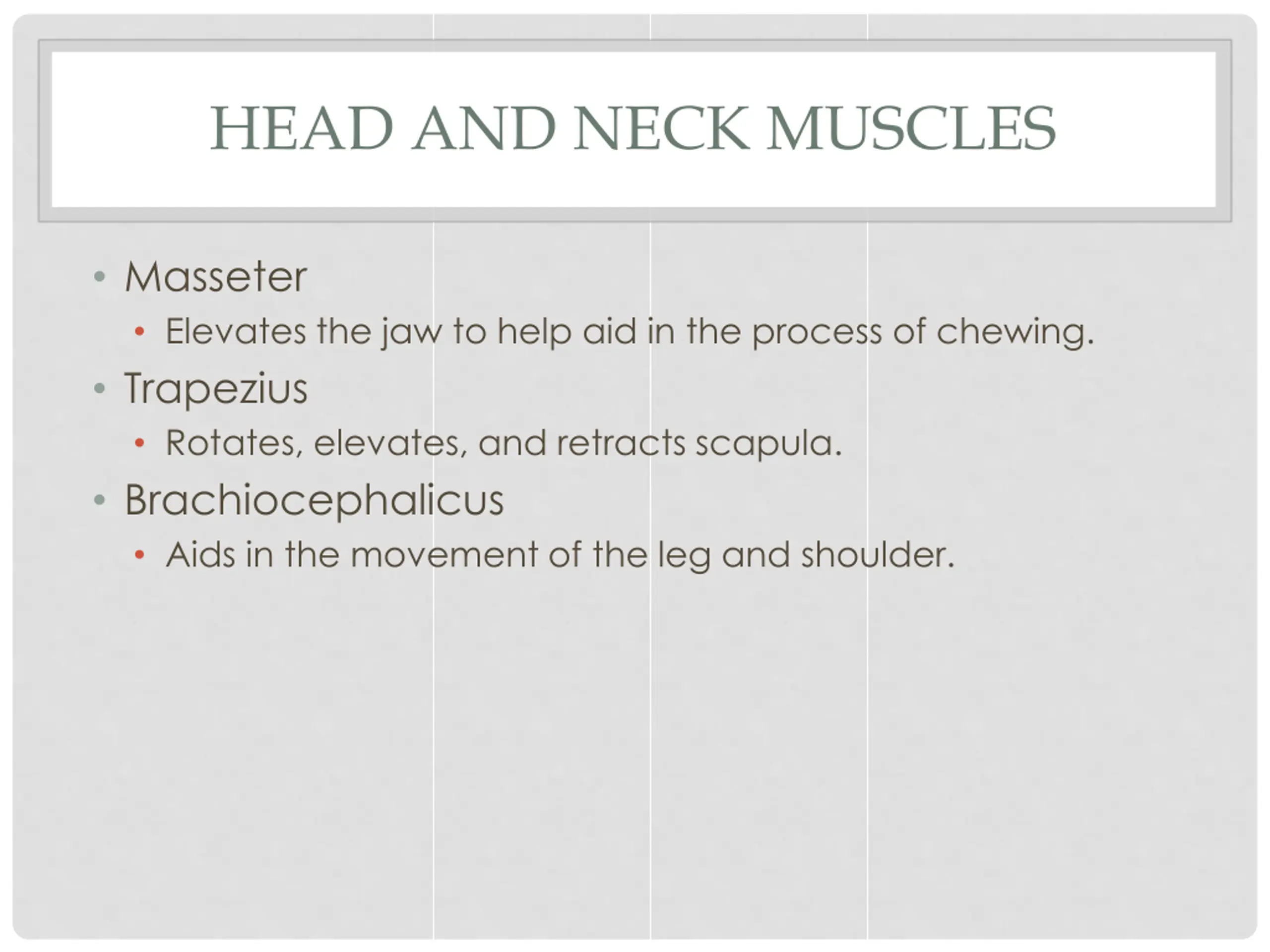 HEAD AND NECK MUSCLES Masseter Elevates the jaw to help aid in the process of chewing. Trapezius Rotates, elevates, and retracts scapula. Brachiocephalicus Aids in the movement of the leg and shoulder.