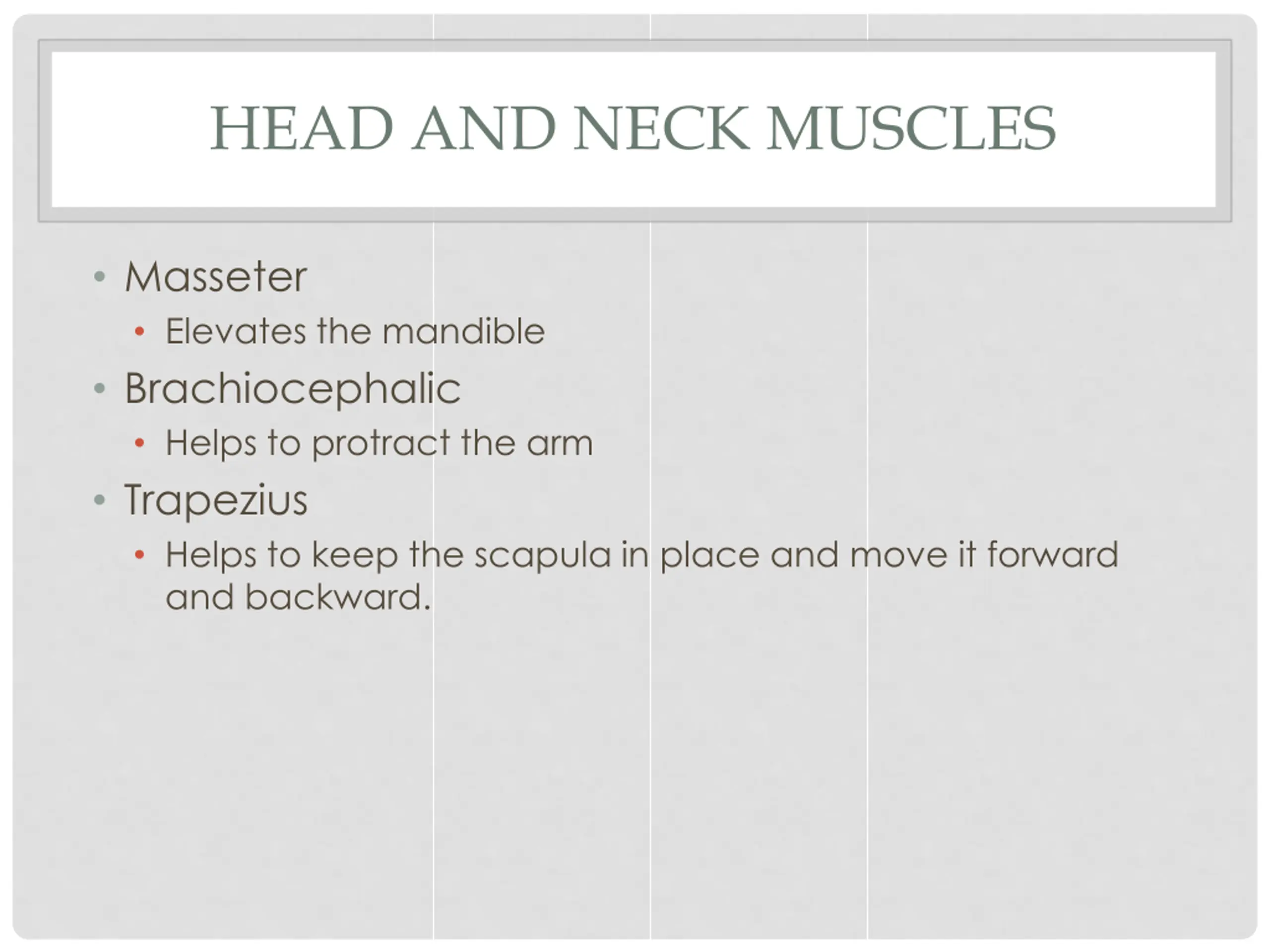 HEAD AND NECK MUSCLES Masseter Elevates the mandible Brachiocephalic Helps to protract the arm Trapezius Helps to keep the scapula in place and move it forward and backward.