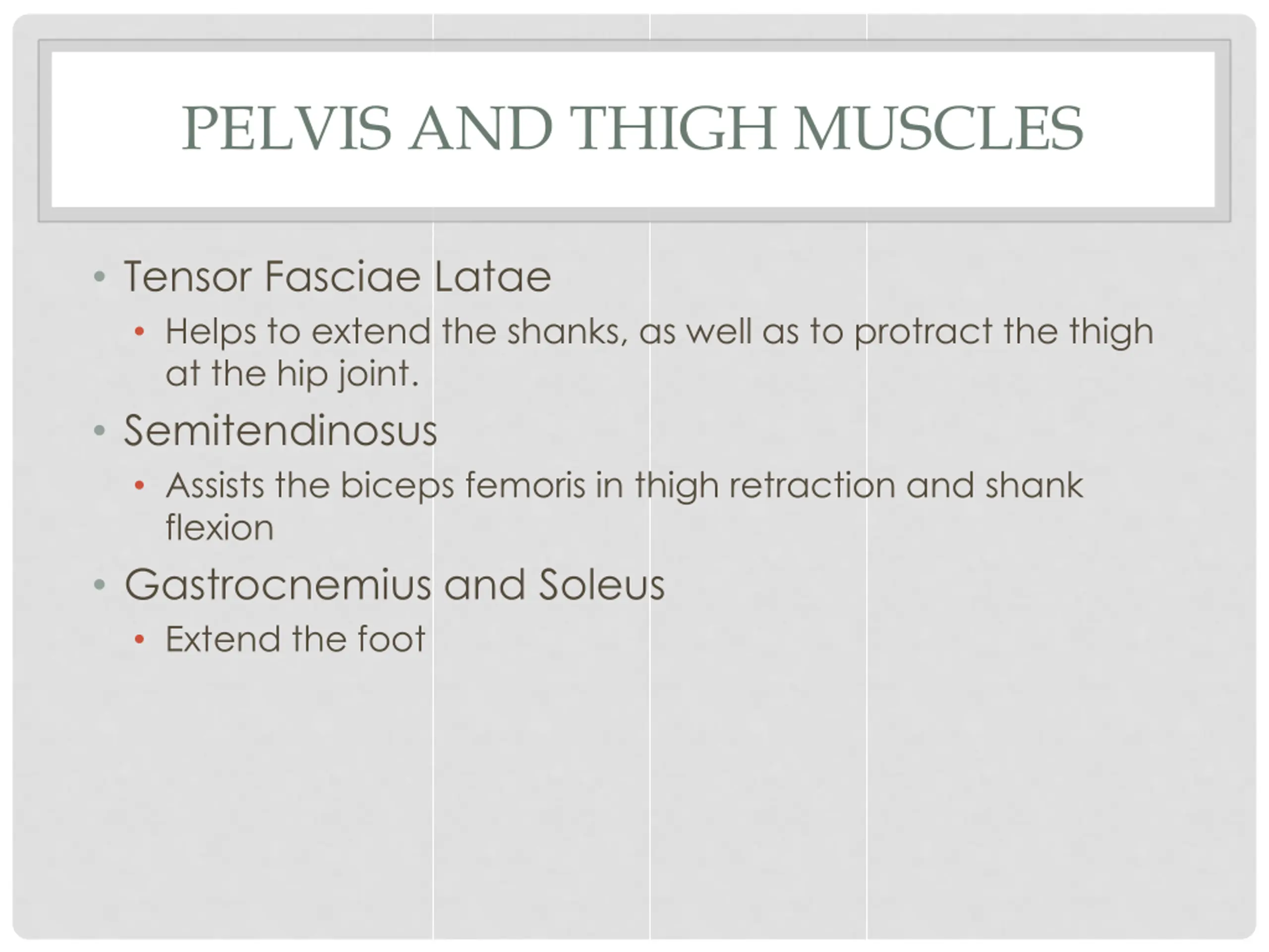 PELVIS AND THIGH MUSCLES Tensor Fasciae Latae Helps to extend the shanks, as well as to protract the thigh at the hip joint. Semitendinosus Assists the biceps femoris in thigh retraction and shank flexion Gastrocnemius and Soleus Extend the foot