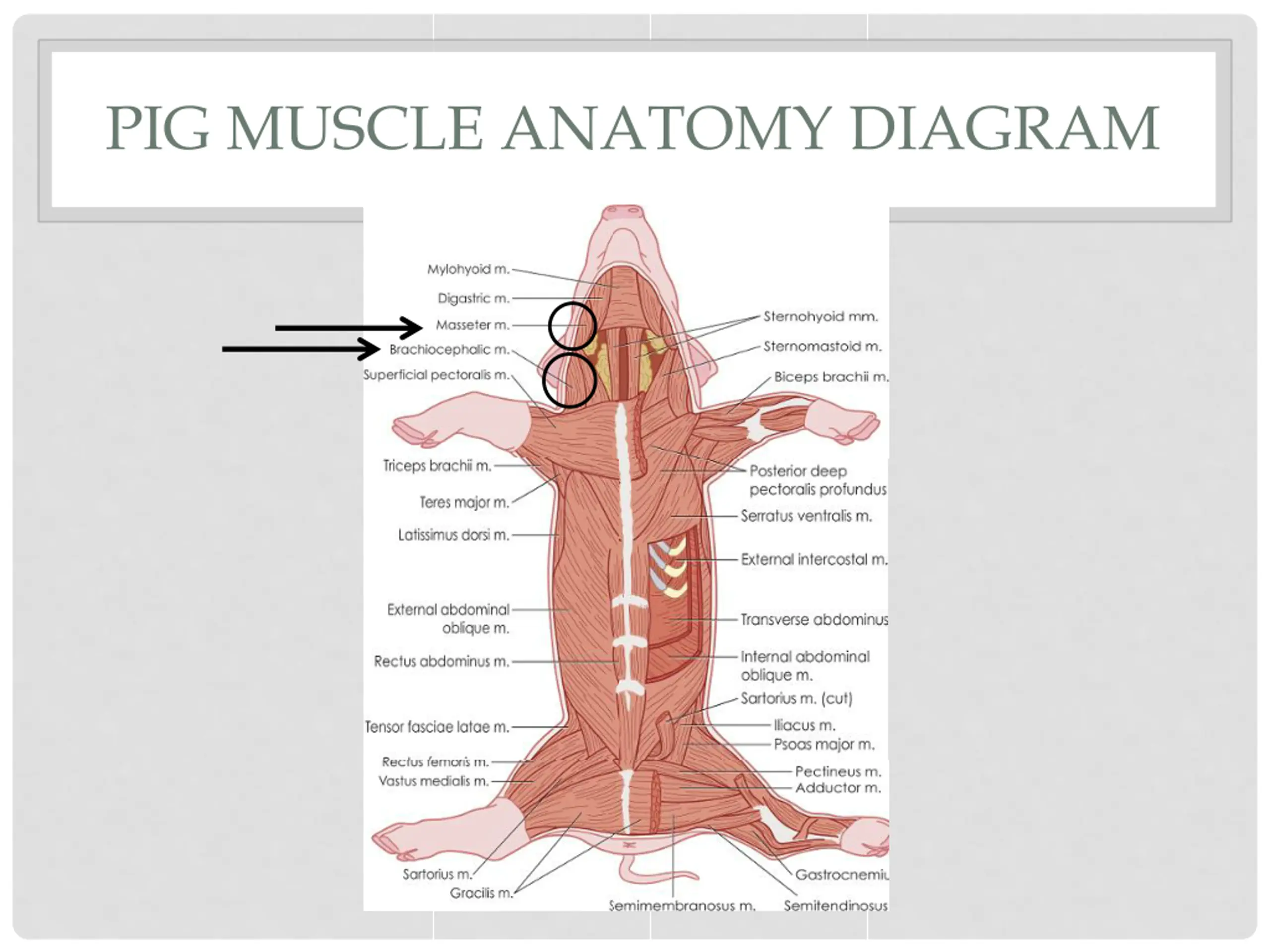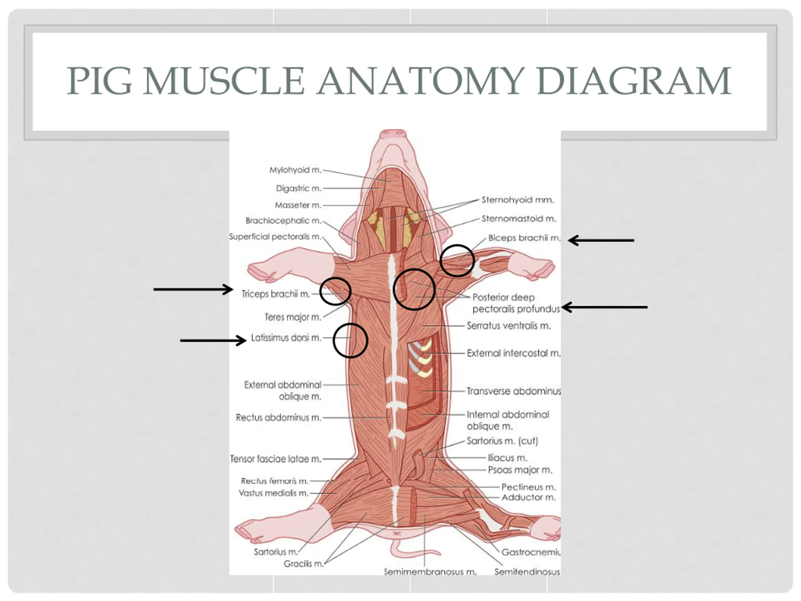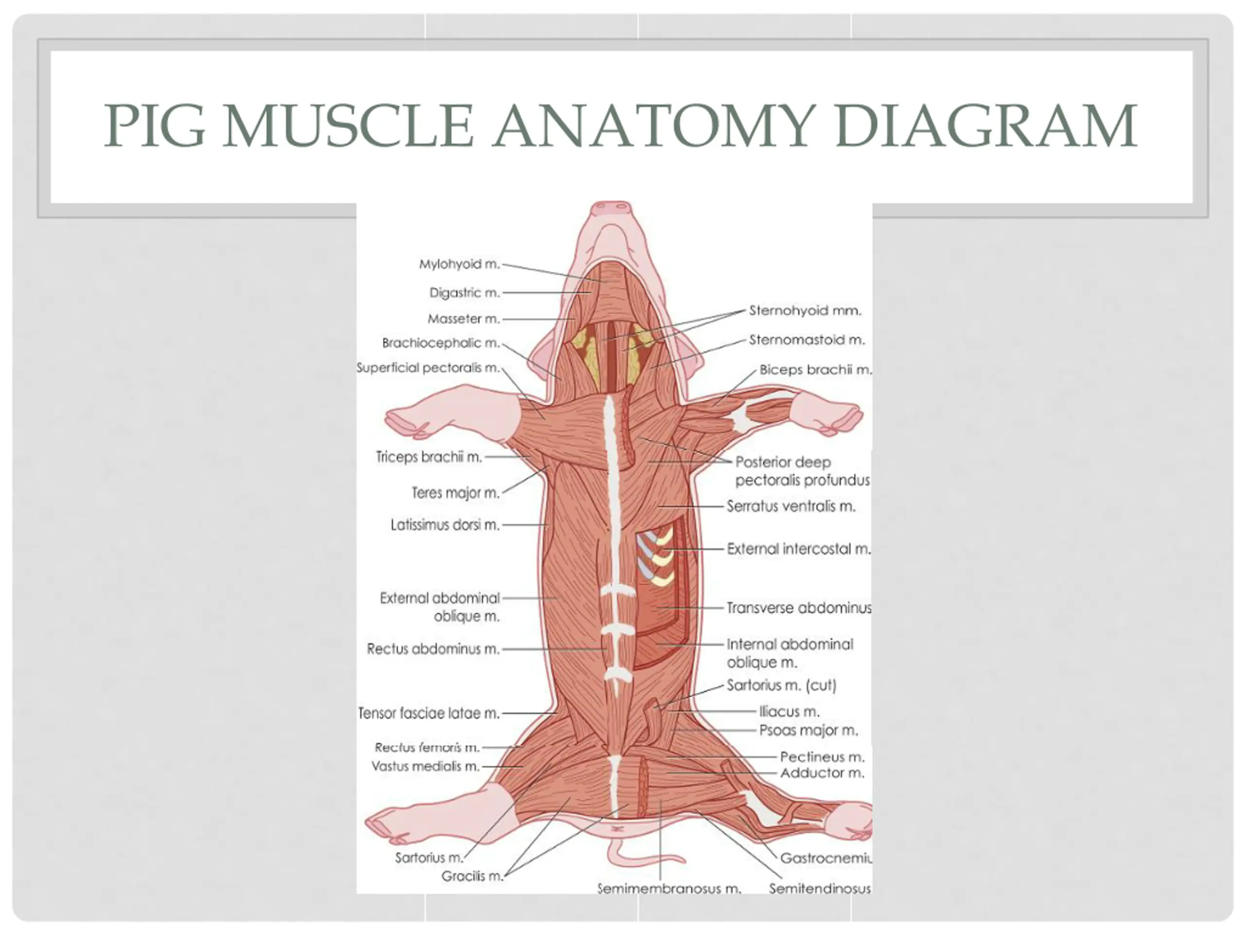 Explore the different types of muscles, including skeletal, smooth, and cardiac muscles, along with detailed diagrams of pig muscle anatomy. Learn about specific muscle groups in the head and neck, arm and shoulder, and pelvis and thigh regions. Enhance your knowledge of muscle identification and function in various animal species.