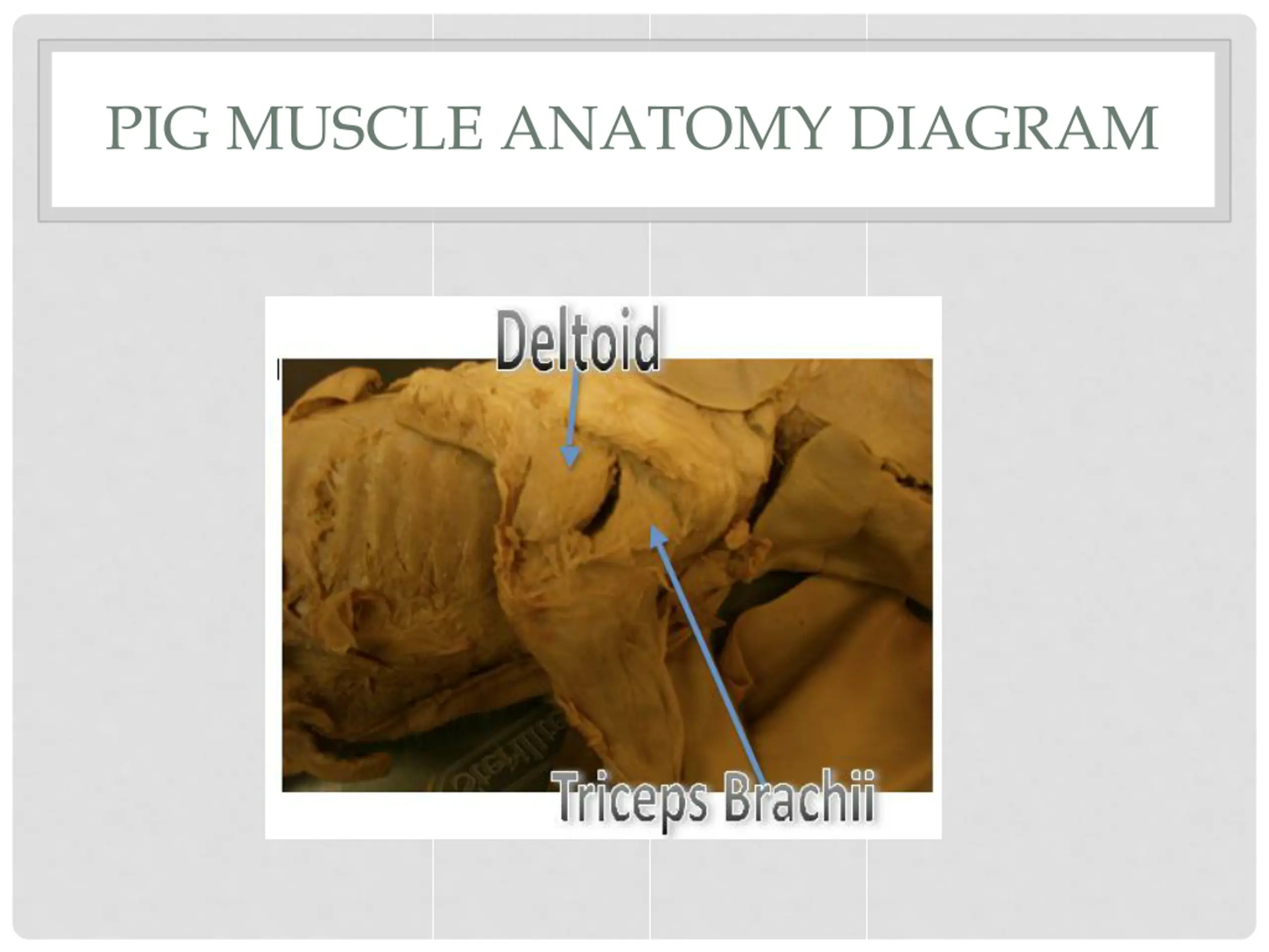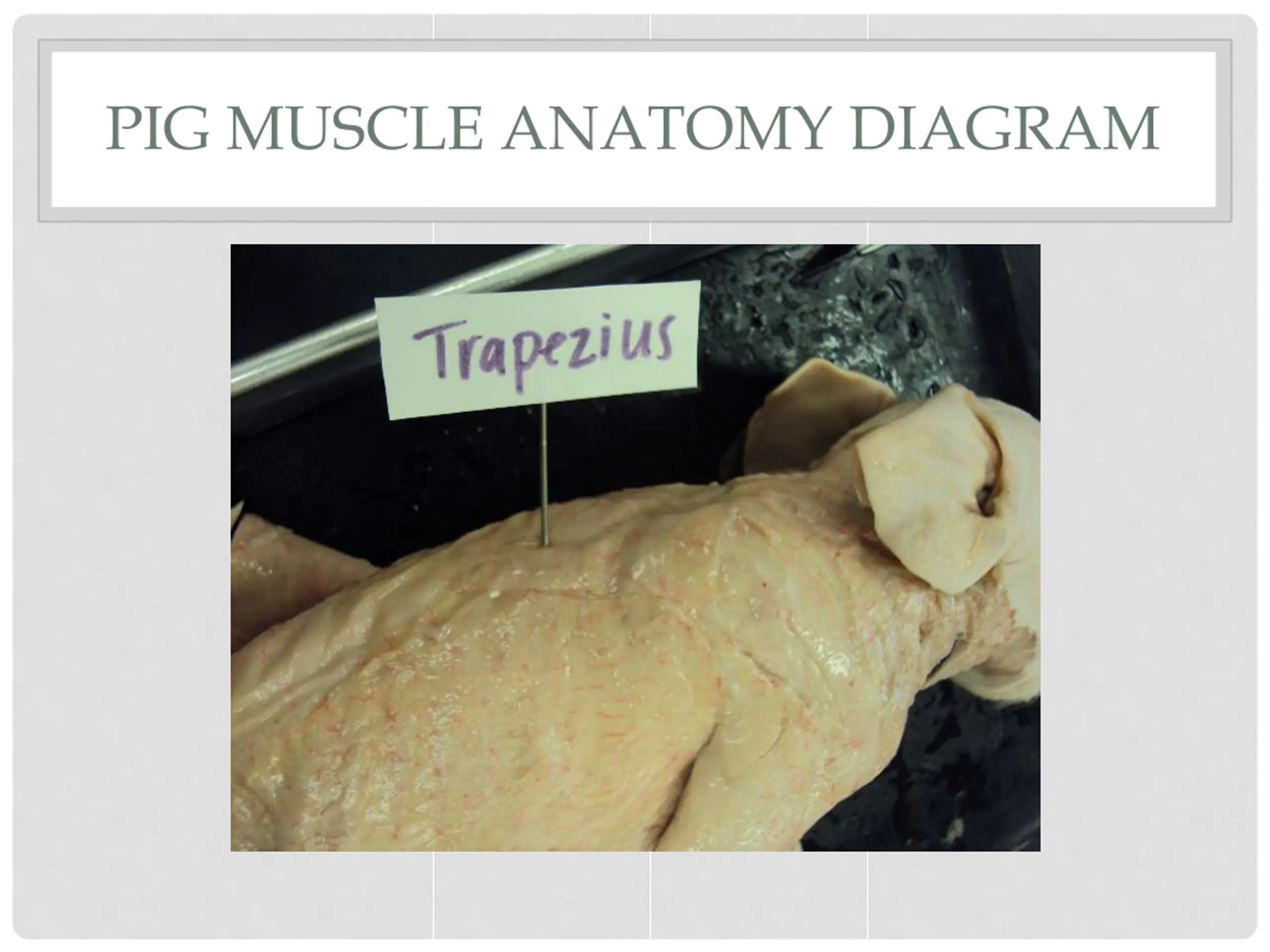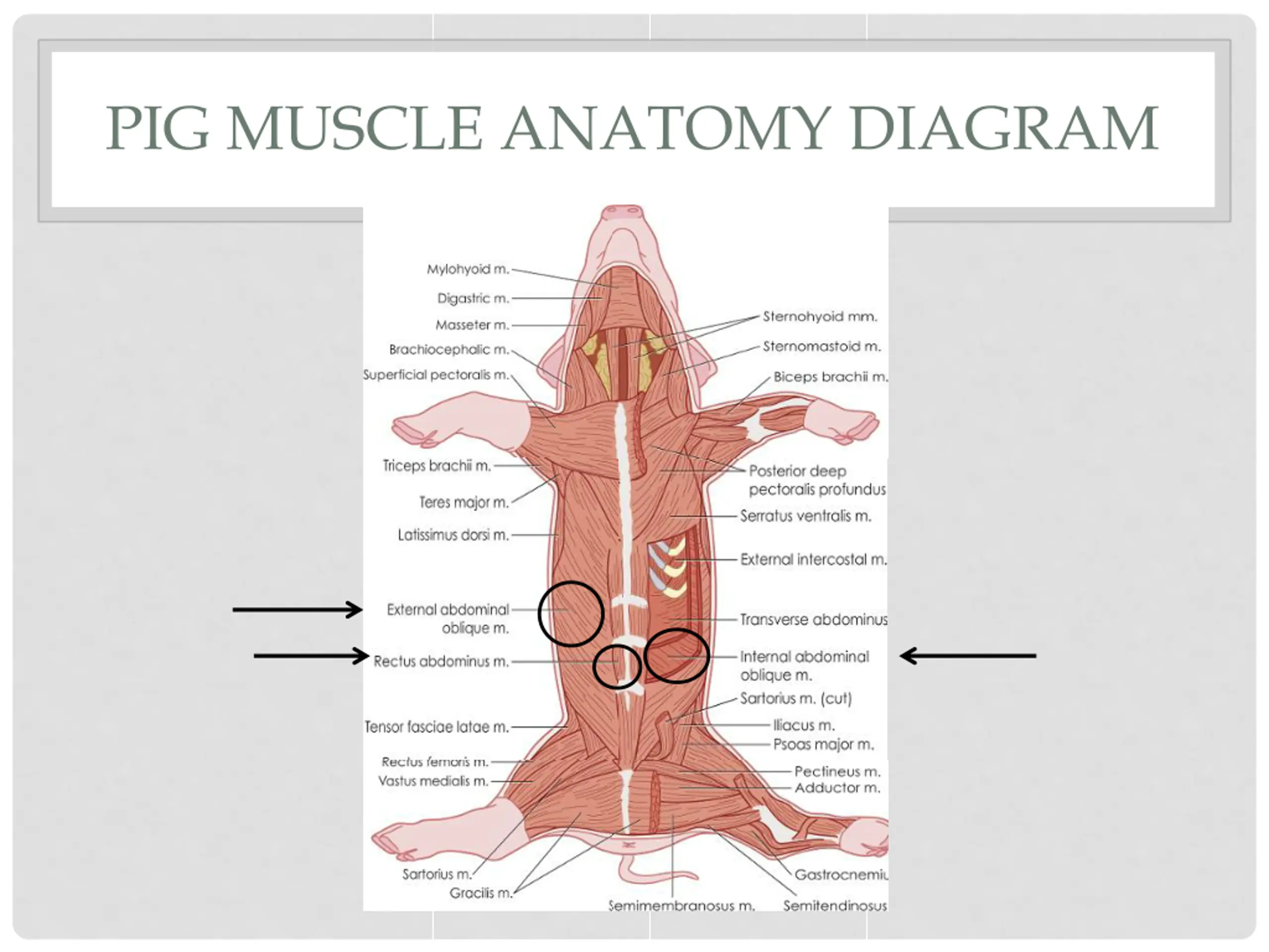 Explore the different types of muscles, including skeletal, smooth, and cardiac muscles, along with detailed diagrams of pig muscle anatomy. Learn about specific muscle groups in the head and neck, arm and shoulder, and pelvis and thigh regions. Enhance your knowledge of muscle identification and function in various animal species.