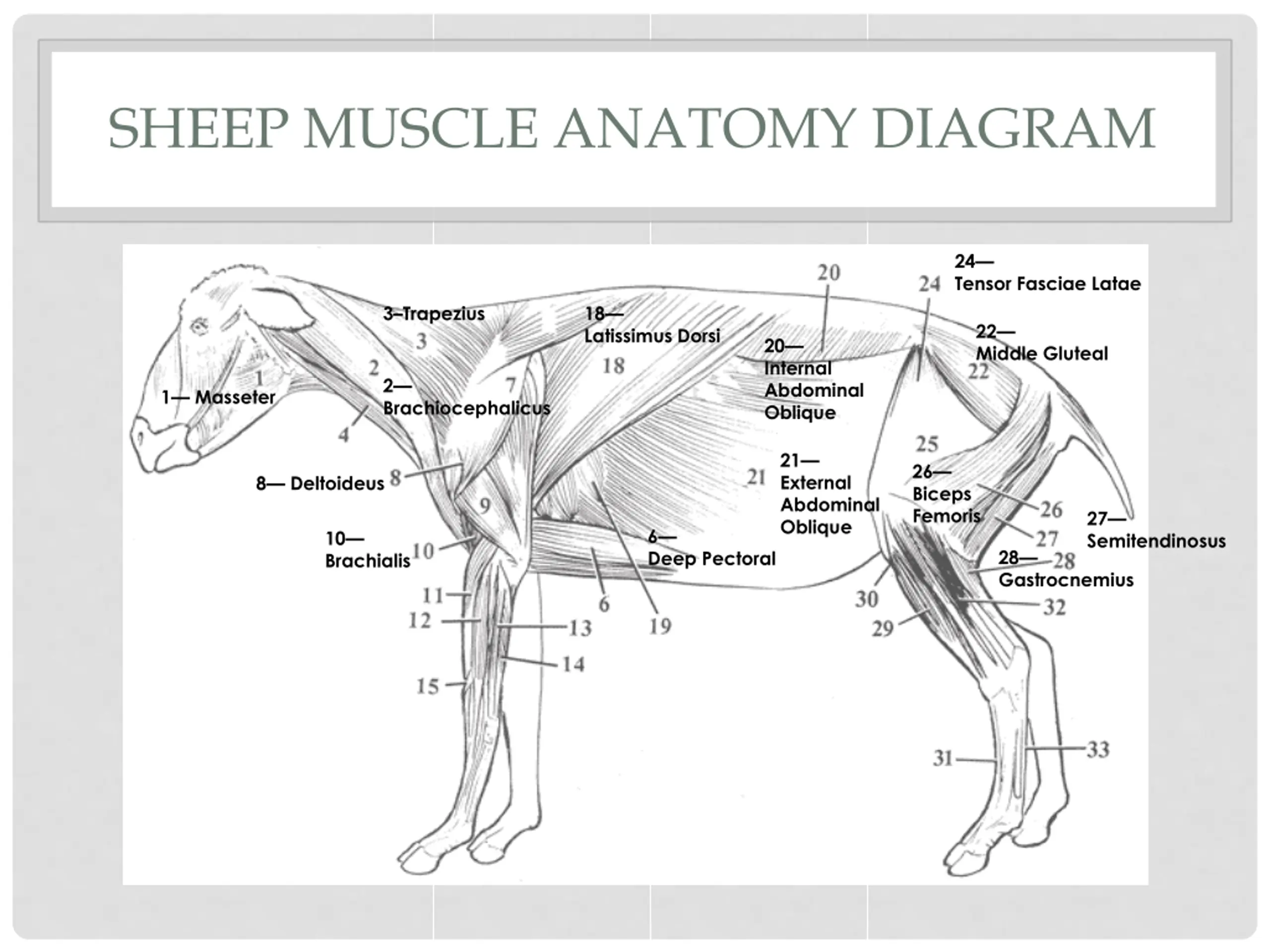 SHEEP MUSCLE ANATOMY DIAGRAM 24 Tensor Fasciae Latae 3 Trapezius 18 Latissimus Dorsi 22 Middle Gluteal 20 Internal Abdominal Oblique 2 Brachiocephalicus 1 Masseter 21 External Abdominal Oblique 26 Biceps Femoris 8 Deltoideus 6 Deep Pectoral 10 Brachialis 28 Gastrocnemius