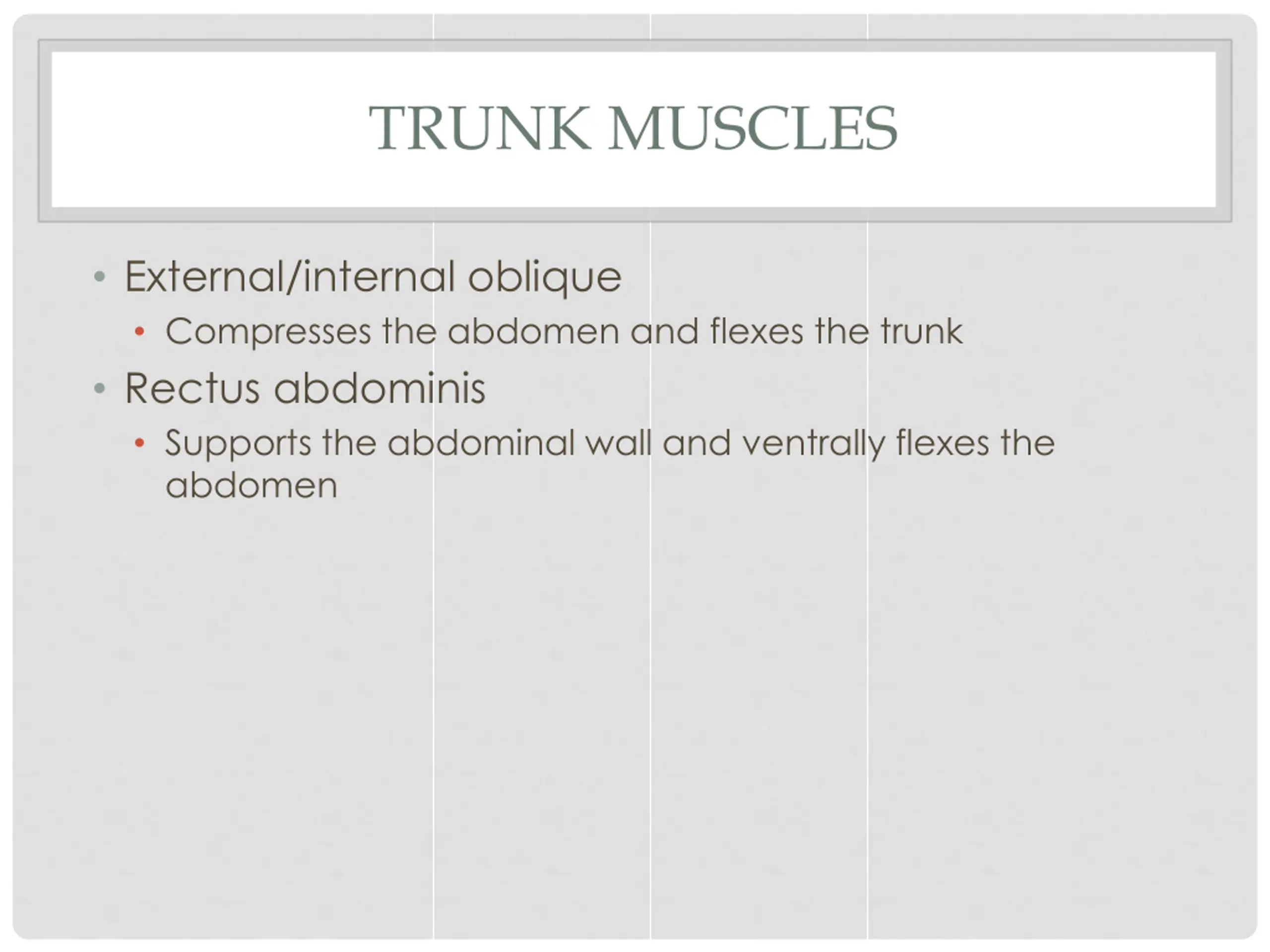 TRUNK MUSCLES External/internal oblique Compresses the abdomen and flexes the trunk Rectus abdominis Supports the abdominal wall and ventrally flexes the abdomen