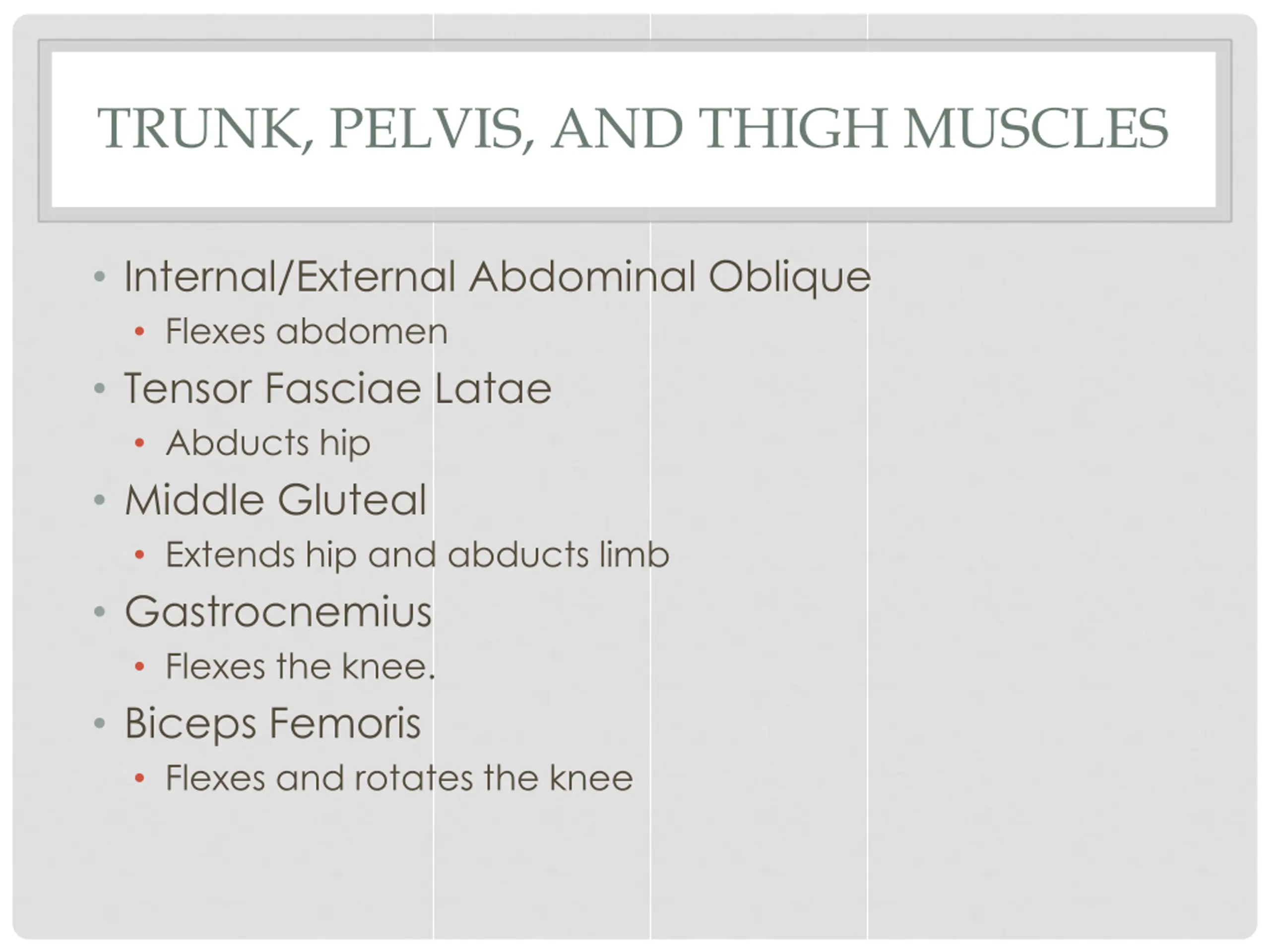 TRUNK, PELVIS, AND THIGH MUSCLES Internal/External Abdominal Oblique Flexes abdomen Tensor Fasciae Latae Abducts hip Middle Gluteal Extends hip and abducts limb Gastrocnemius Flexes the knee. Biceps Femoris Flexes and rotates the knee