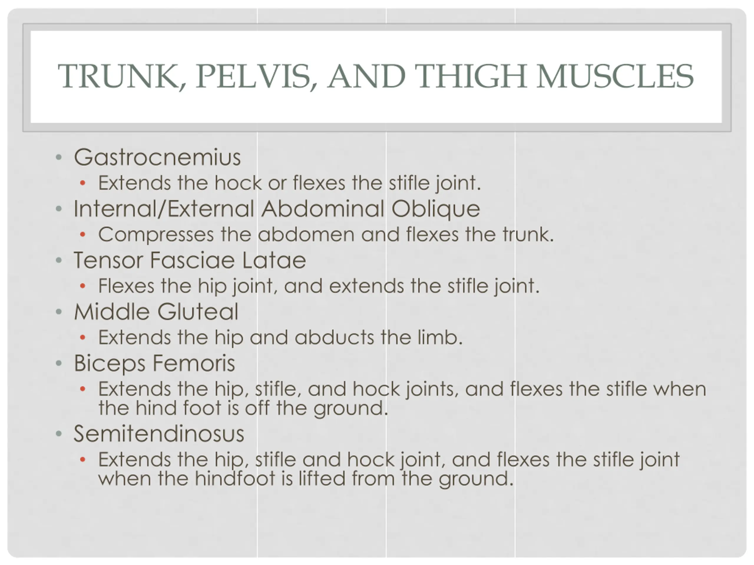TRUNK, PELVIS, AND THIGH MUSCLES Gastrocnemius Extends the hock or flexes the stifle joint. Internal/External Abdominal Oblique Compresses the abdomen and flexes the trunk. Tensor Fasciae Latae Flexes the hip joint, and extends the stifle joint. Middle Gluteal Extends the hip and abducts the limb. Biceps Femoris Extends the hip, stifle, and hock joints, and flexes the stifle when the hind foot is off the ground. Semitendinosus Extends the hip, stifle and hock joint, and flexes the stifle joint when the hindfoot is lifted from the ground.