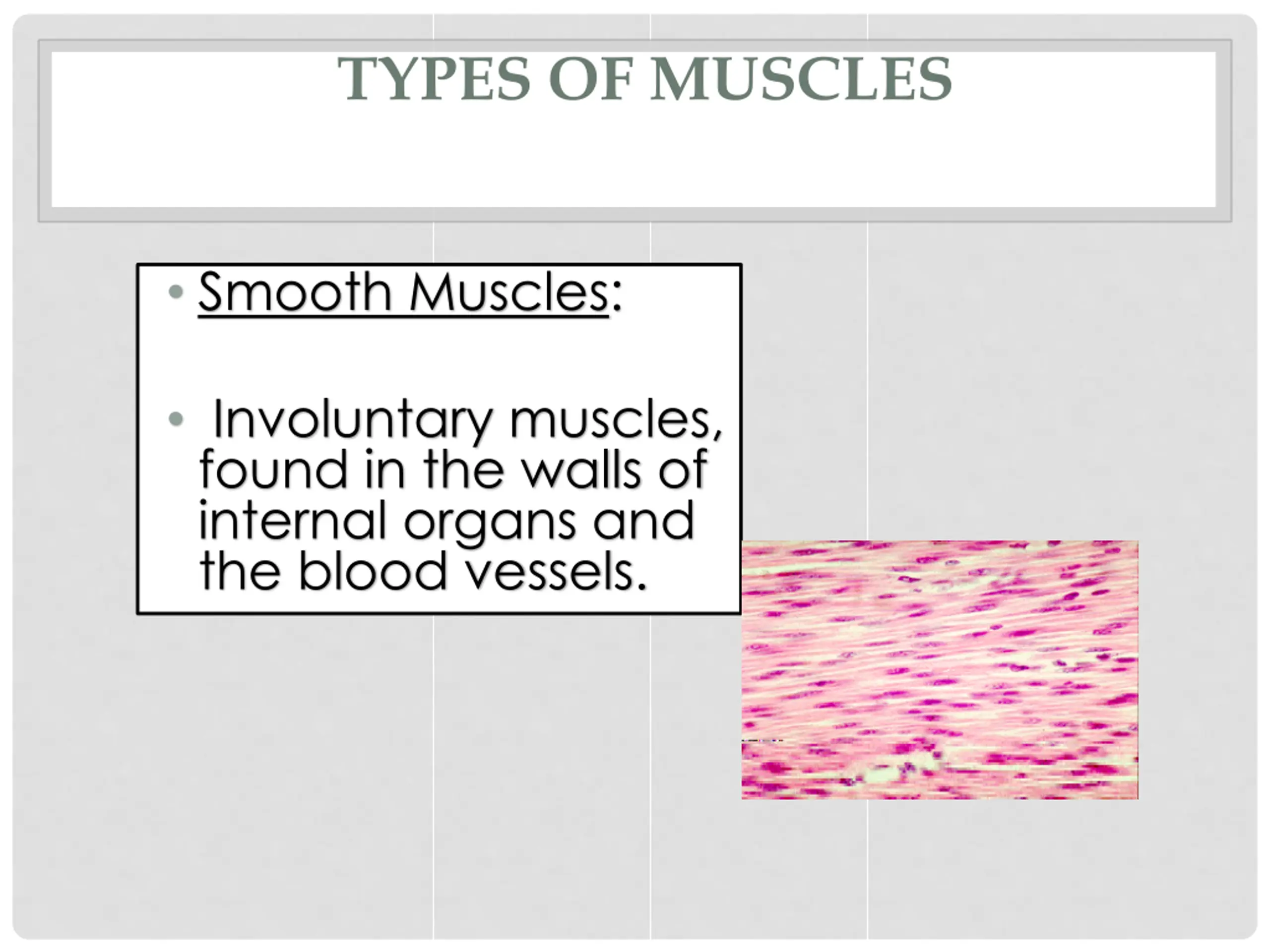 TYPES OF MUSCLES Smooth Muscles: Involuntary muscles, found in the walls of internal organs and the blood vessels.