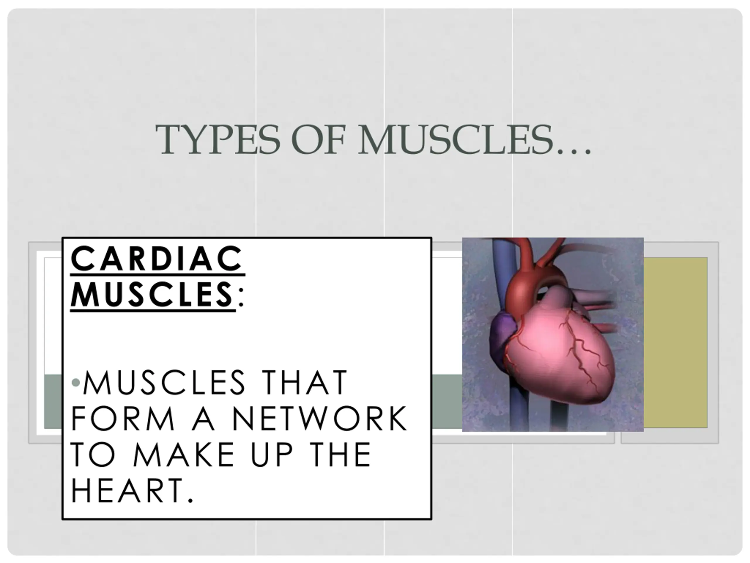 TYPES OF MUSCLES CARDIAC MUSCLES: MUSCLES THAT FORM A NETWORK TO MAKE UP THE HEART.