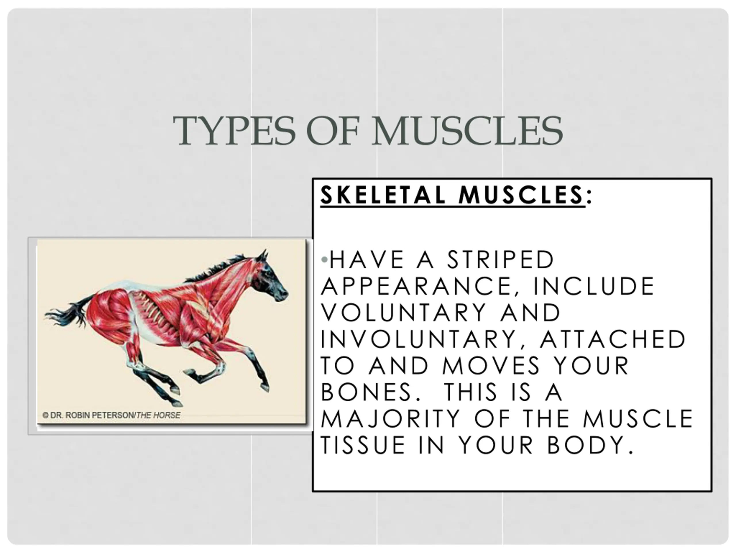 TYPES OF MUSCLES SKELETAL MUSCLES: HAVE A STRIPED APPEARANCE, INCLUDE VOLUNTARY AND INVOLUNTARY, ATTACHED TO AND MOVES YOUR BONES. THIS IS A MAJORITY OF THE MUSCLE TISSUE IN YOUR BODY.