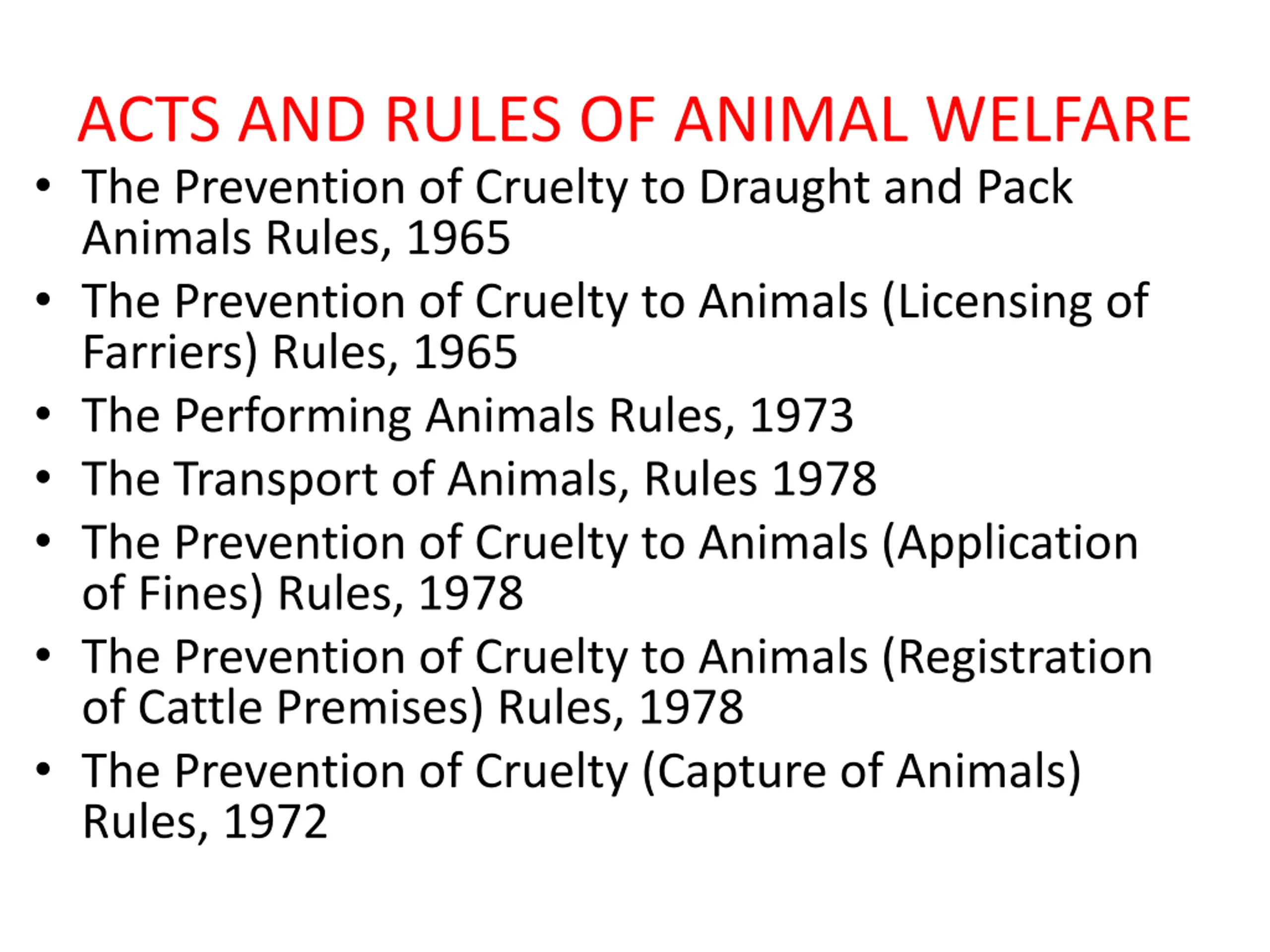 ACTS AND RULES OF ANIMAL WELFARE The Prevention of Cruelty to Draught and Pack Animals Rules, 1965 The Prevention of Cruelty to Animals (Licensing of Farriers) Rules, 1965 The Performing Animals Rules, 1973 The Transport of Animals, Rules 1978 The Prevention of Cruelty to Animals (Application of Fines) Rules, 1978 The Prevention of Cruelty to Animals (Registration of Cattle Premises) Rules, 1978 The Prevention of Cruelty (Capture of Animals) Rules, 1972