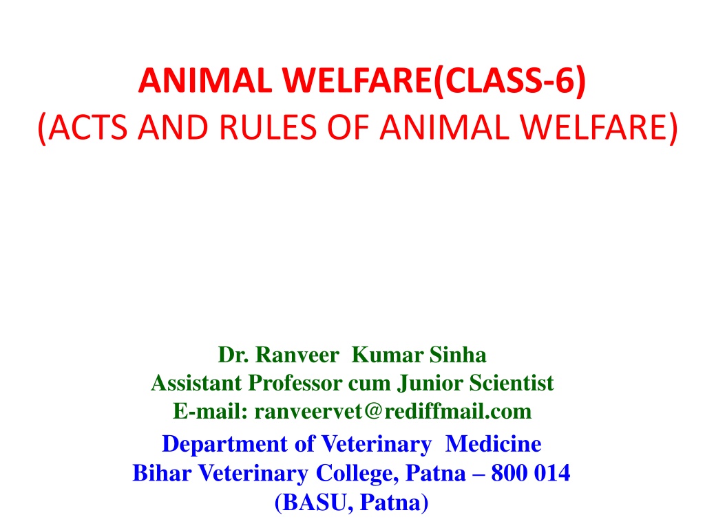 ANIMAL WELFARE(CLASS-6) (ACTS AND RULES OF ANIMAL WELFARE) Dr. Ranveer Kumar Sinha Assistant Professor cum Junior Scientist E-mail: ranveervet@rediffmail.com Department of Veterinary Medicine Bihar Veterinary College, Patna 800 014 (BASU, Patna)