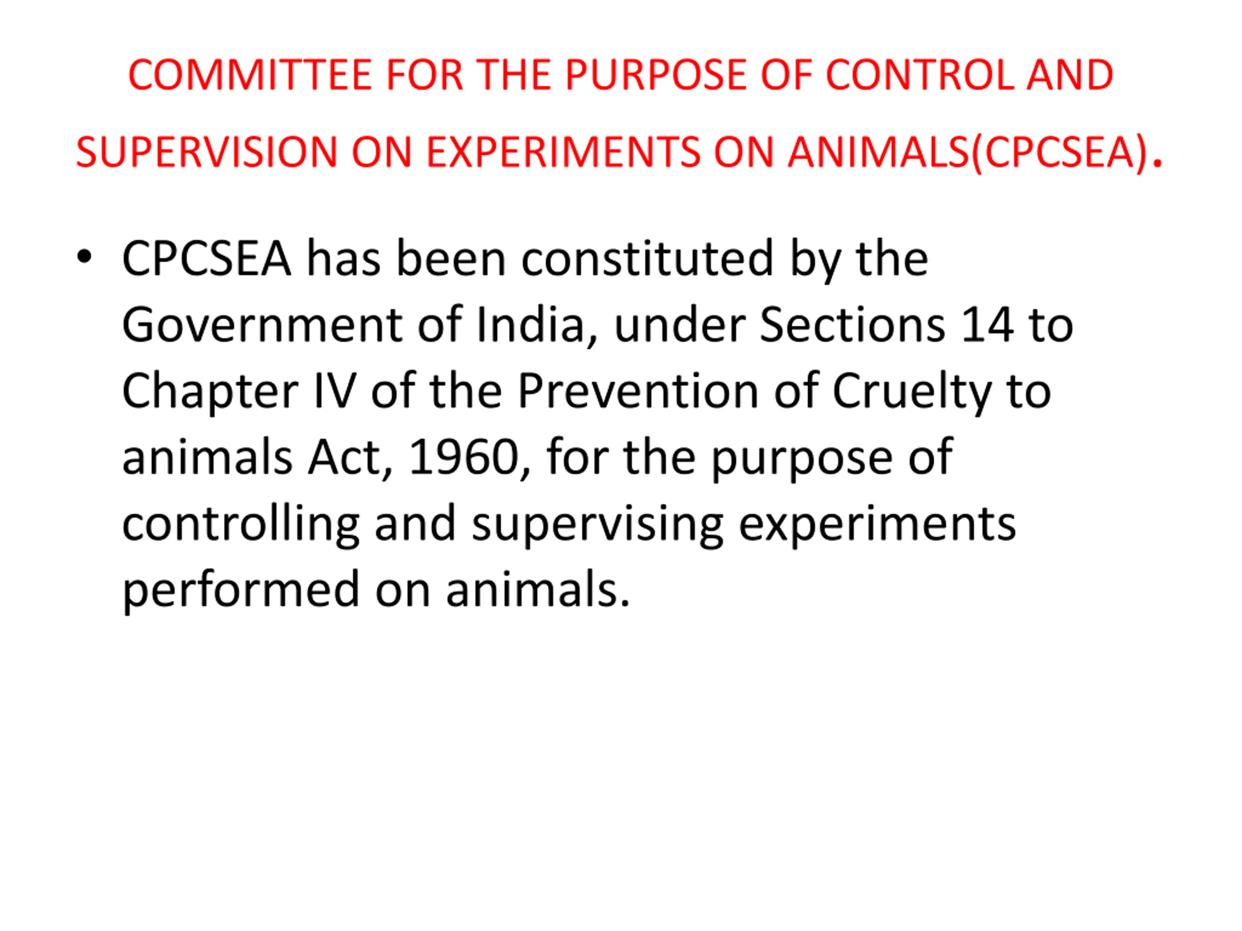 COMMITTEE FOR THE PURPOSE OF CONTROL AND SUPERVISION ON EXPERIMENTS ON ANIMALS(CPCSEA). CPCSEA has been constituted by the Government of India, under Sections 14 to Chapter IV of the Prevention of Cruelty to animals Act, 1960, for the purpose of controlling and supervising experiments performed on animals.