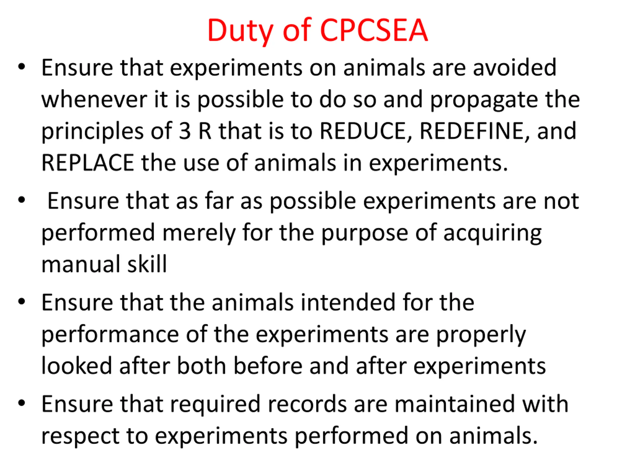 Duty of CPCSEA Ensure that experiments on animals are avoided whenever it is possible to do so and propagate the principles of 3 R that is to REDUCE, REDEFINE, and REPLACE the use of animals in experiments. Ensure that as far as possible experiments are not performed merely for the purpose of acquiring manual skill Ensure that the animals intended for the performance of the experiments are properly looked after both before and after experiments Ensure that required records are maintained with respect to experiments performed on animals.