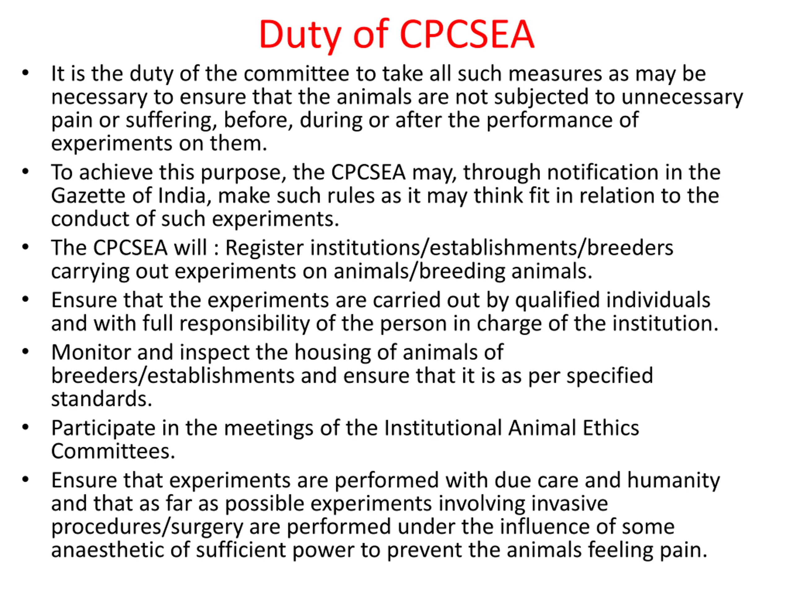 Duty of CPCSEA It is the duty of the committee to take all such measures as may be necessary to ensure that the animals are not subjected to unnecessary pain or suffering, before, during or after the performance of experiments on them. To achieve this purpose, the CPCSEA may, through notification in the Gazette of India, make such rules as it may think fit in relation to the conduct of such experiments. The CPCSEA will : Register institutions/establishments/breeders carrying out experiments on animals/breeding animals. Ensure that the experiments are carried out by qualified individuals and with full responsibility of the person in charge of the institution. Monitor and inspect the housing of animals of breeders/establishments and ensure that it is as per specified standards. Participate in the meetings of the Institutional Animal Ethics Committees. Ensure that experiments are performed with due care and humanity and that as far as possible experiments involving invasive procedures/surgery are performed under the influence of some anaesthetic of sufficient power to prevent the animals feeling pain.