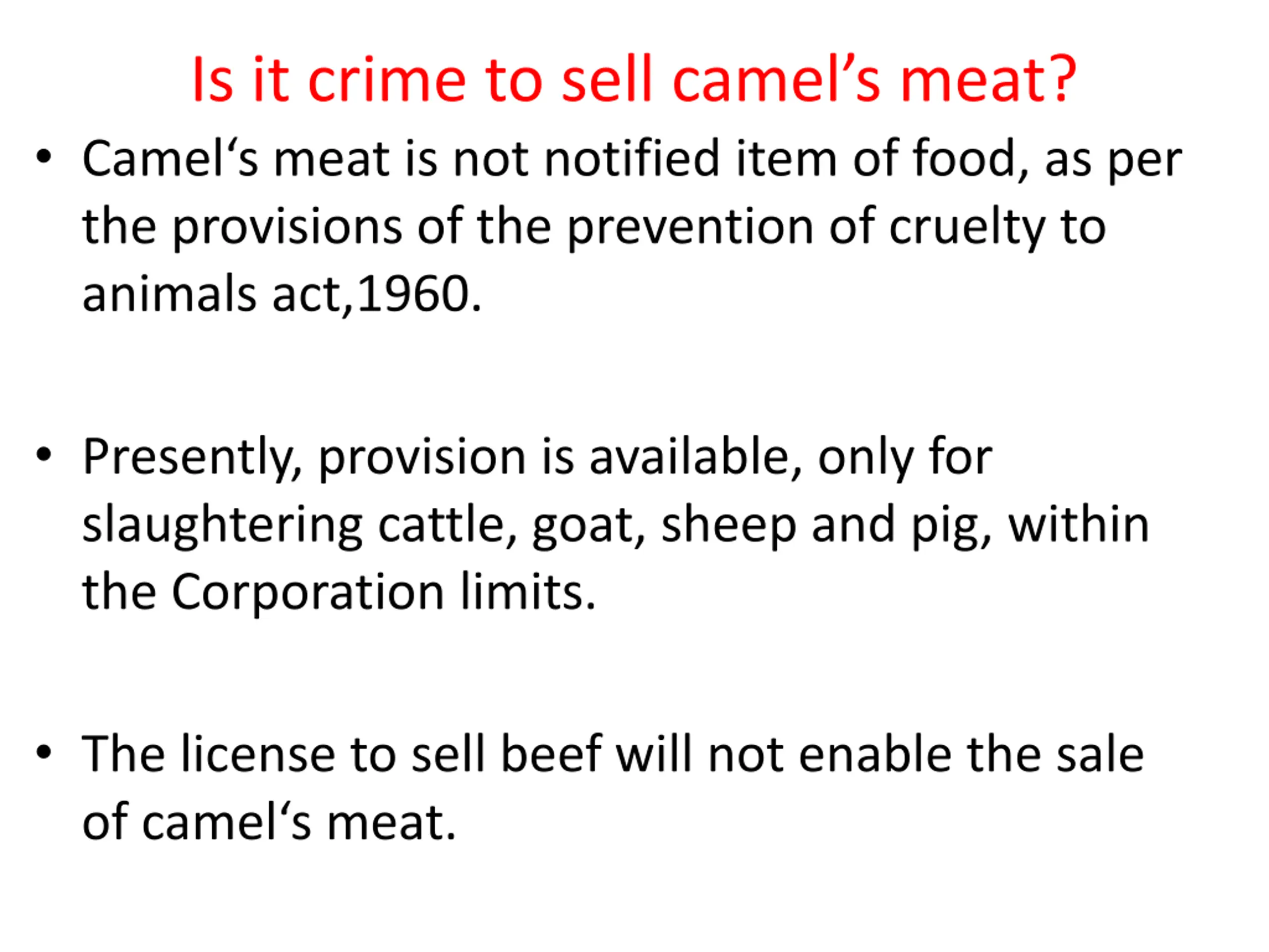 Is it crime to sell camels meat? Camel s meat is not notified item of food, as per the provisions of the prevention of cruelty to animals act,1960. Presently, provision is available, only for slaughtering cattle, goat, sheep and pig, within the Corporation limits. The license to sell beef will not enable the sale of camel s meat.