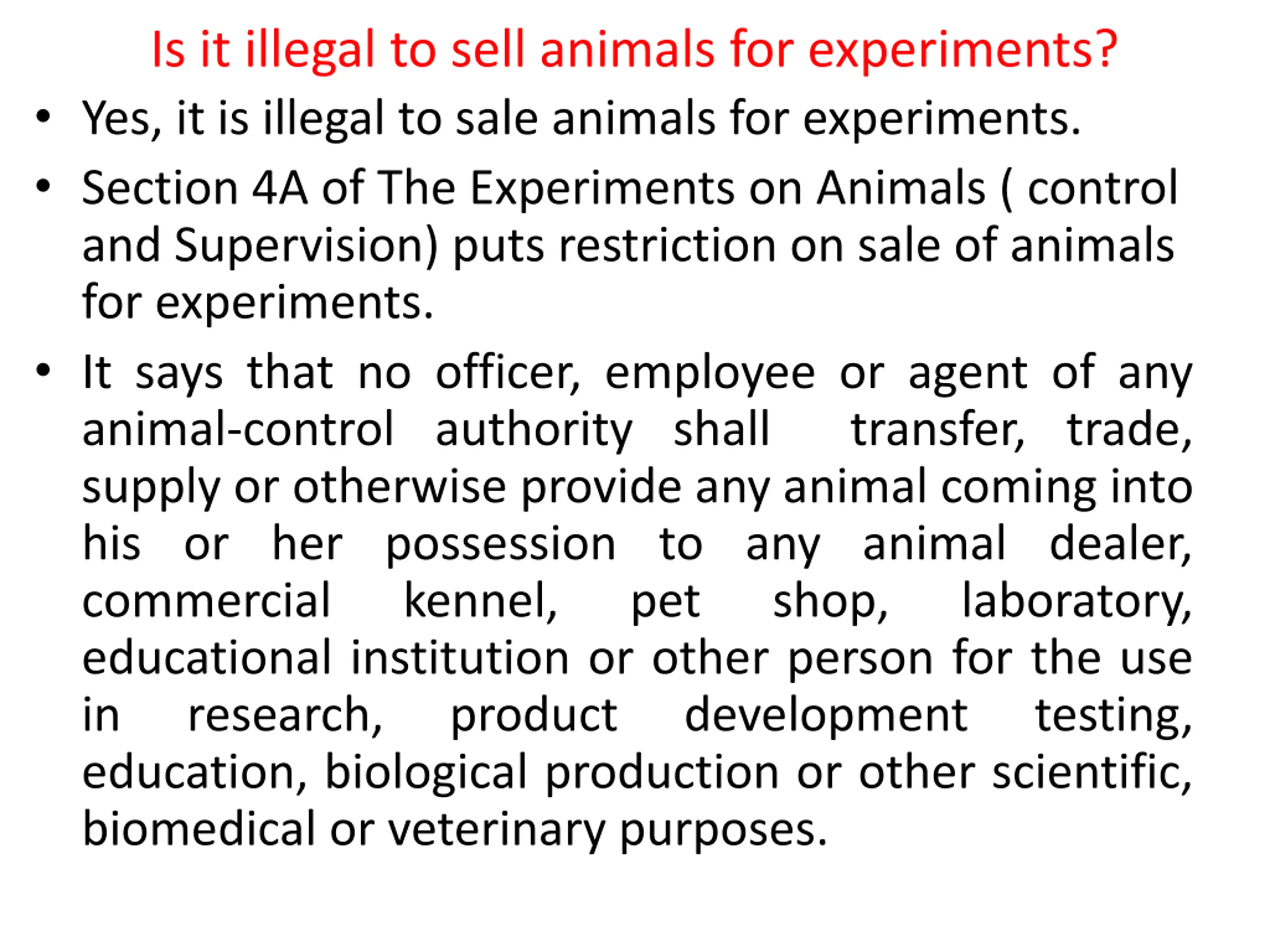 Is it illegal to sell animals for experiments? Yes, it is illegal to sale animals for experiments. Section 4A of The Experiments on Animals ( control and Supervision) puts restriction on sale of animals for experiments. It says that no officer, employee or agent of any animal-control authority shall transfer, trade, supply or otherwise provide any animal coming into his or her possession to any animal dealer, commercial kennel, educational institution or other person for the use in research, product education, biological production or other scientific, biomedical or veterinary purposes. pet shop, laboratory, development testing,