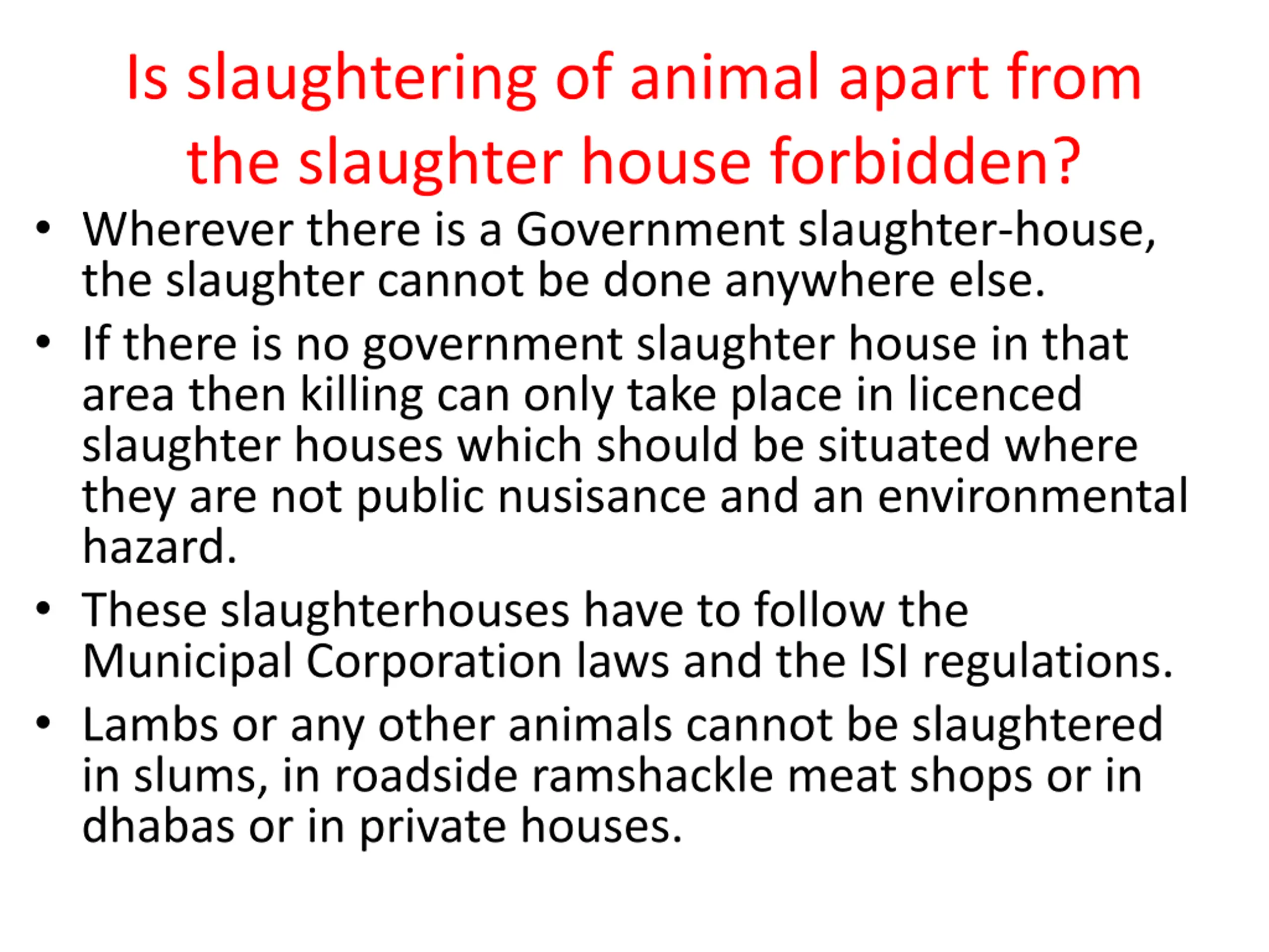 Is slaughtering of animal apart from the slaughter house forbidden? Wherever there is a Government slaughter-house, the slaughter cannot be done anywhere else. If there is no government slaughter house in that area then killing can only take place in licenced slaughter houses which should be situated where they are not public nusisance and an environmental hazard. These slaughterhouses have to follow the Municipal Corporation laws and the ISI regulations. Lambs or any other animals cannot be slaughtered in slums, in roadside ramshackle meat shops or in dhabas or in private houses.