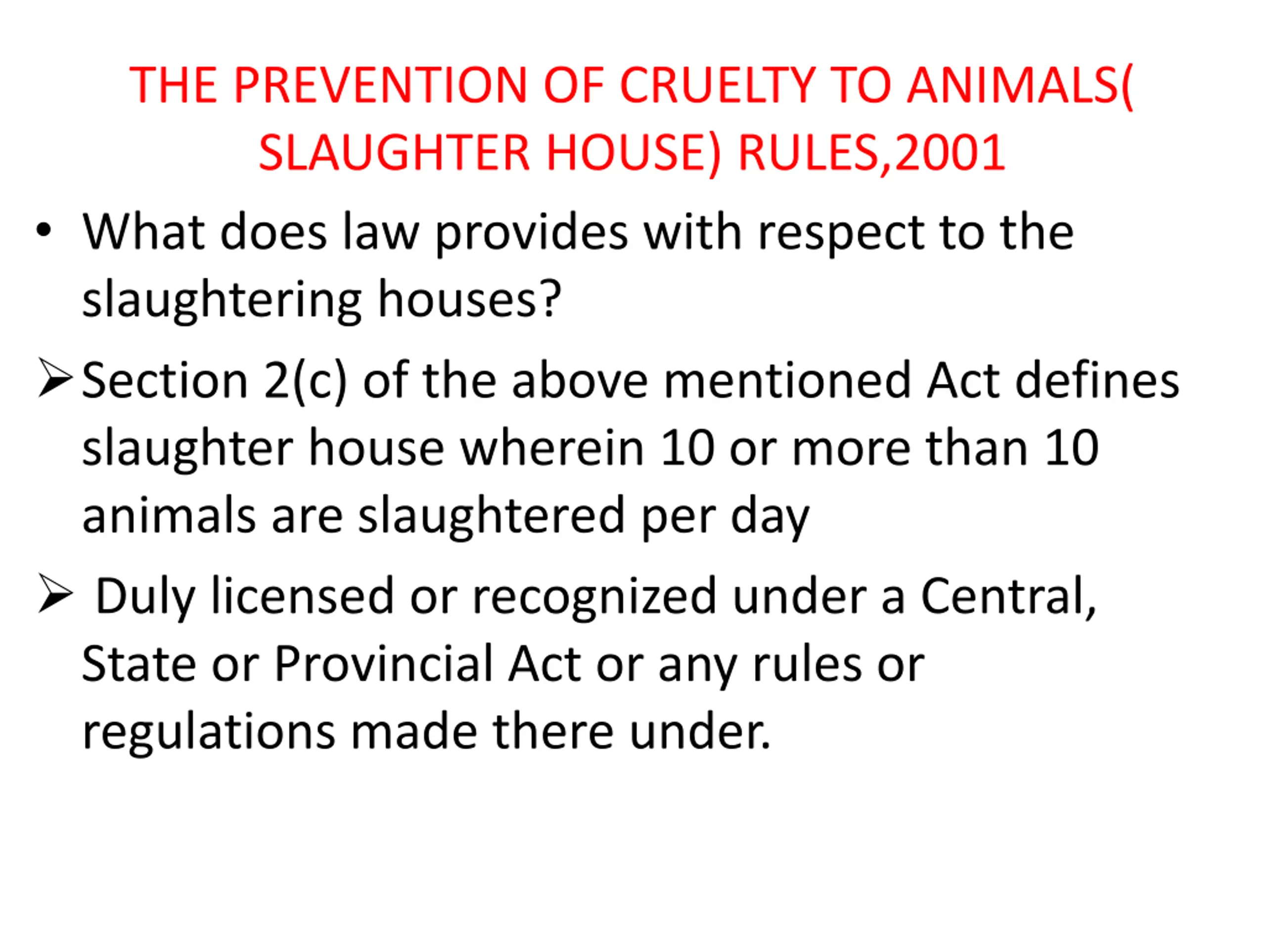 THE PREVENTION OF CRUELTY TO ANIMALS( SLAUGHTER HOUSE) RULES,2001 What does law provides with respect to the slaughtering houses? Section 2(c) of the above mentioned Act defines slaughter house wherein 10 or more than 10 animals are slaughtered per day Duly licensed or recognized under a Central, State or Provincial Act or any rules or regulations made there under.