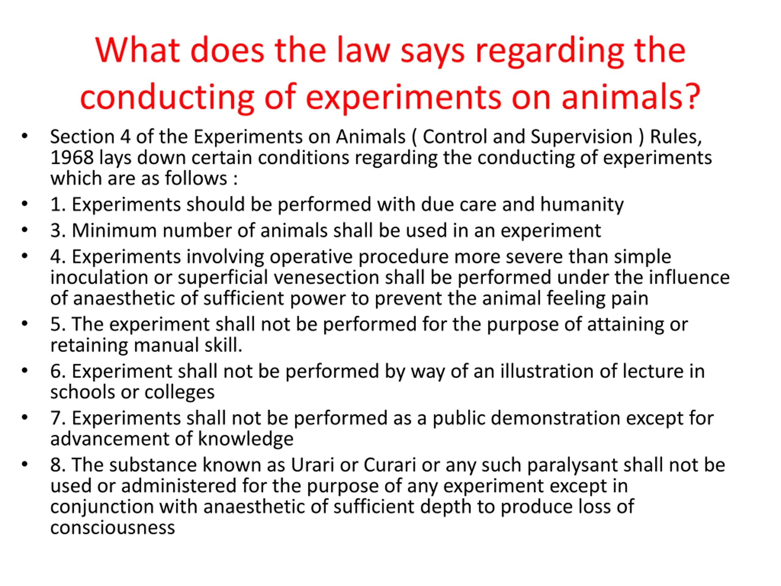 What does the law says regarding the conducting of experiments on animals? Section 4 of the Experiments on Animals ( Control and Supervision ) Rules, 1968 lays down certain conditions regarding the conducting of experiments which are as follows : 1. Experiments should be performed with due care and humanity 3. Minimum number of animals shall be used in an experiment 4. Experiments involving operative procedure more severe than simple inoculation or superficial venesection shall be performed under the influence of anaesthetic of sufficient power to prevent the animal feeling pain 5. The experiment shall not be performed for the purpose of attaining or retaining manual skill. 6. Experiment shall not be performed by way of an illustration of lecture in schools or colleges 7. Experiments shall not be performed as a public demonstration except for advancement of knowledge 8. The substance known as Urari or Curari or any such paralysant shall not be used or administered for the purpose of any experiment except in conjunction with anaesthetic of sufficient depth to produce loss of consciousness