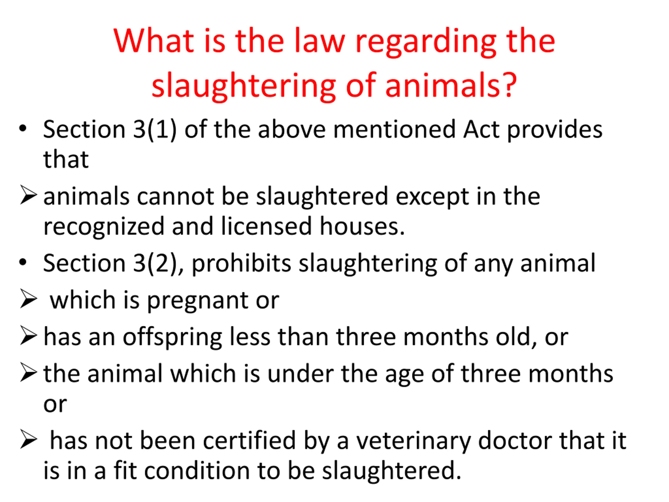 What is the law regarding the slaughtering of animals? Section 3(1) of the above mentioned Act provides that animals cannot be slaughtered except in the recognized and licensed houses. Section 3(2), prohibits slaughtering of any animal which is pregnant or has an offspring less than three months old, or the animal which is under the age of three months or has not been certified by a veterinary doctor that it is in a fit condition to be slaughtered.