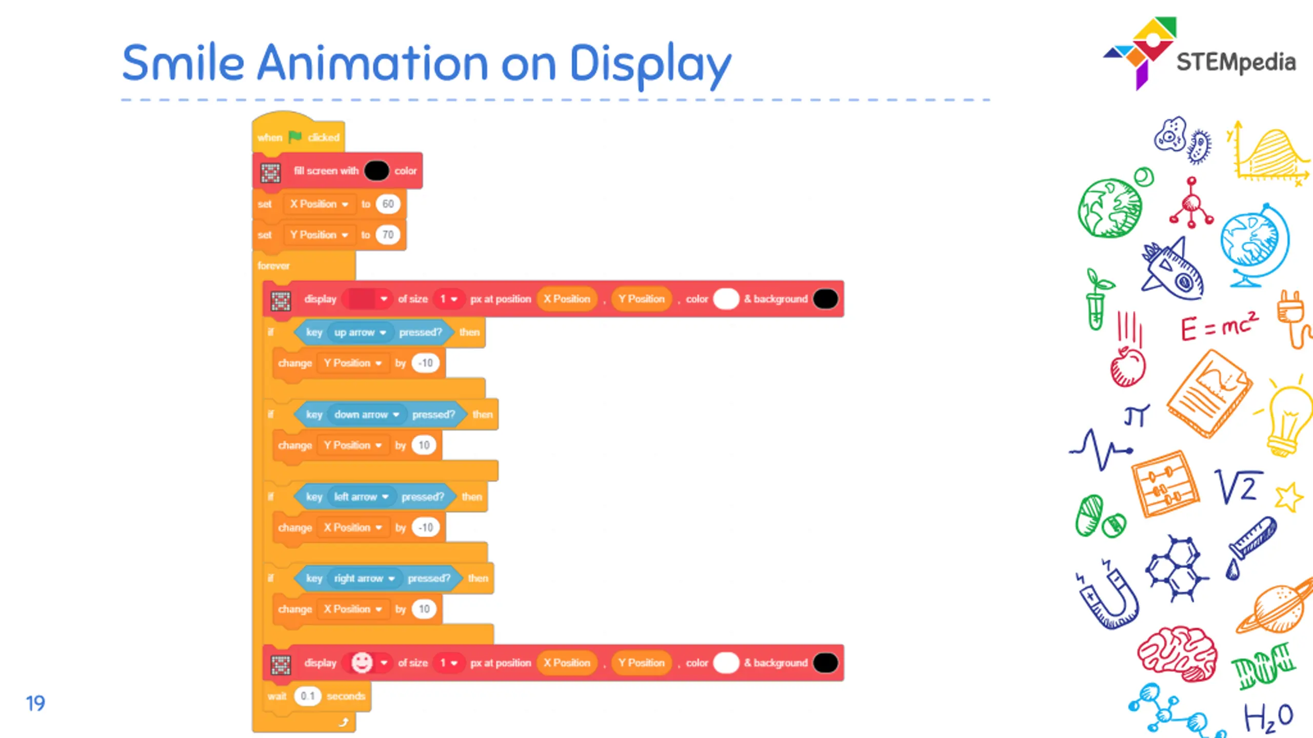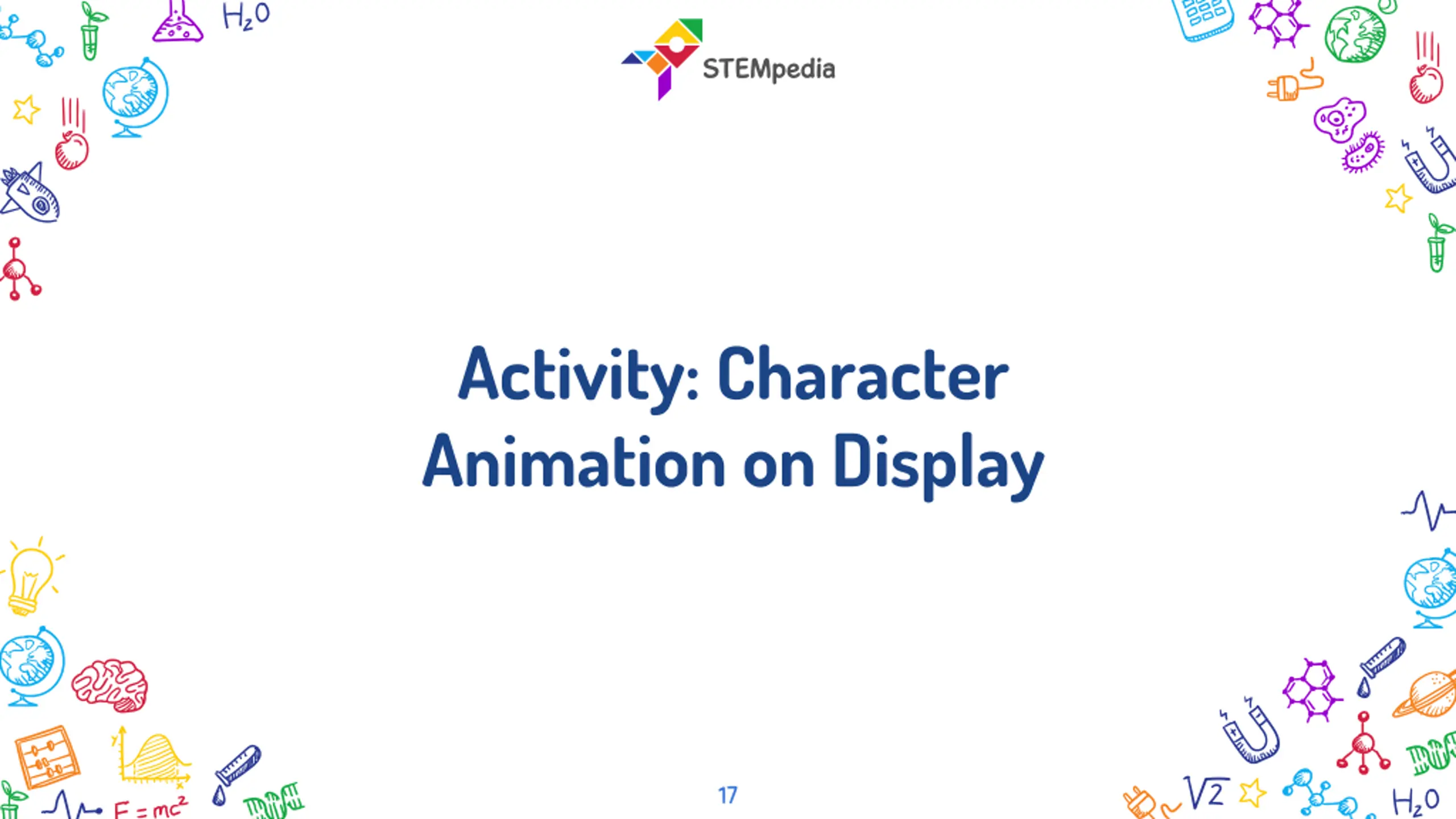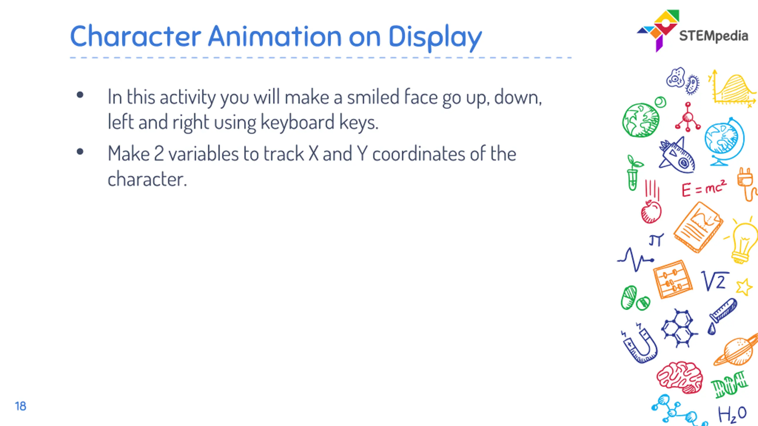 Character Animation on Display In this activity you will make a smiled face go up, down, left and right using keyboard keys. Make 2 variables to track X and Y coordinates of the character. 18