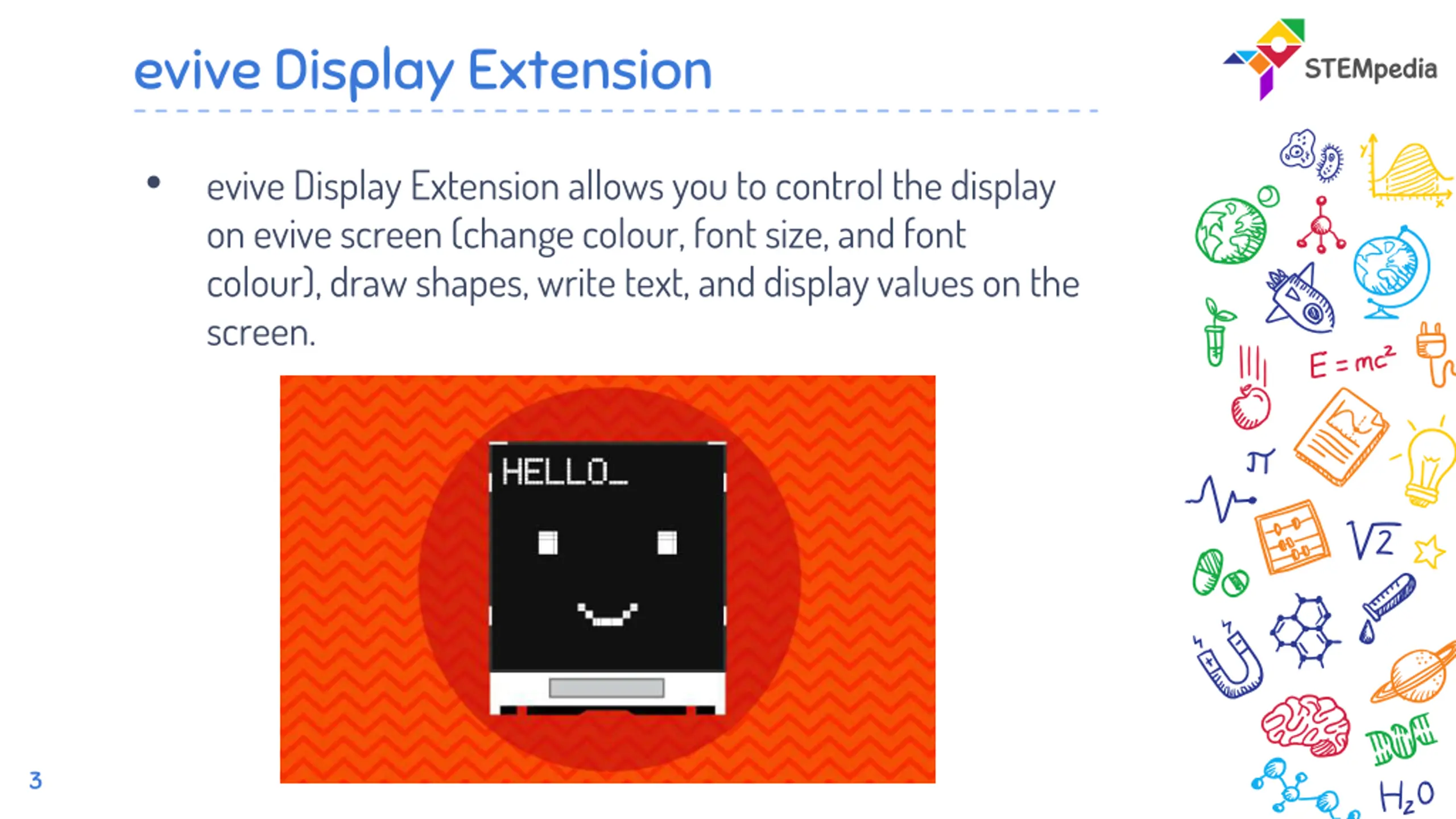 evive Display Extension evive Display Extension allows you to control the display on evive screen (change colour, font size, and font colour), draw shapes, write text, and display values on the screen. 3
