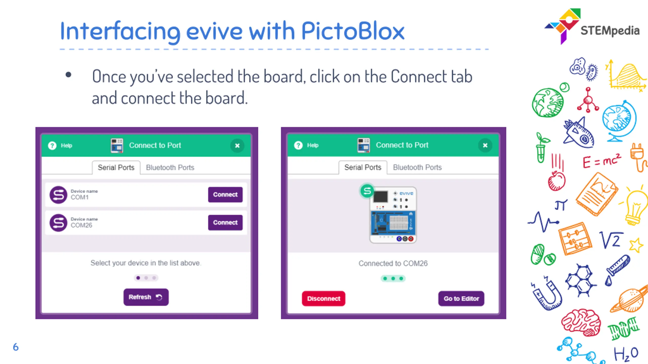 Interfacing evive with PictoBlox Once you ve selected the board, click on the Connect tab and connect the board. 6