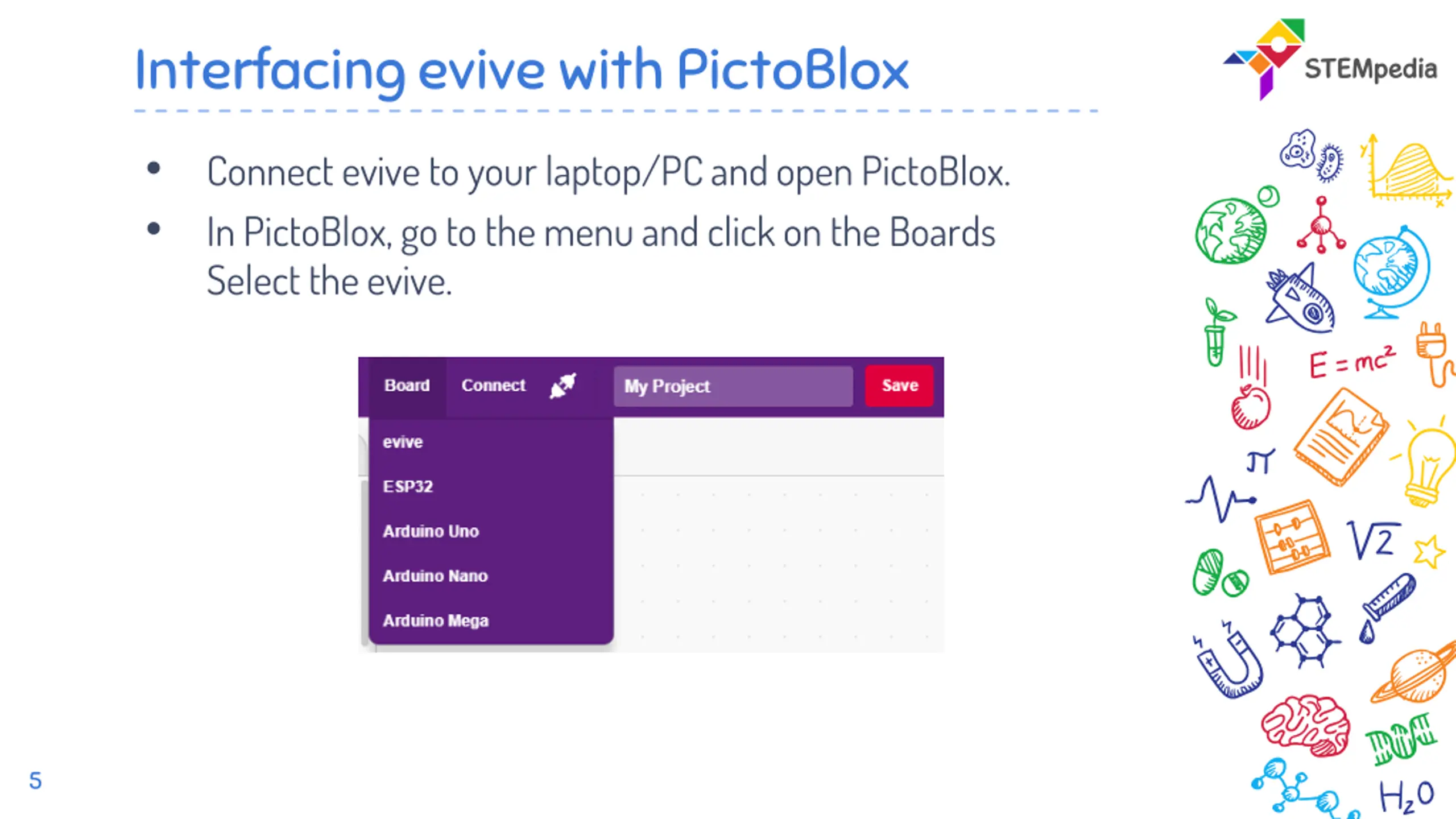 Interfacing evive with PictoBlox Connect evive to your laptop/PC and open PictoBlox. In PictoBlox, go to the menu and click on the Boards Select the evive. 5