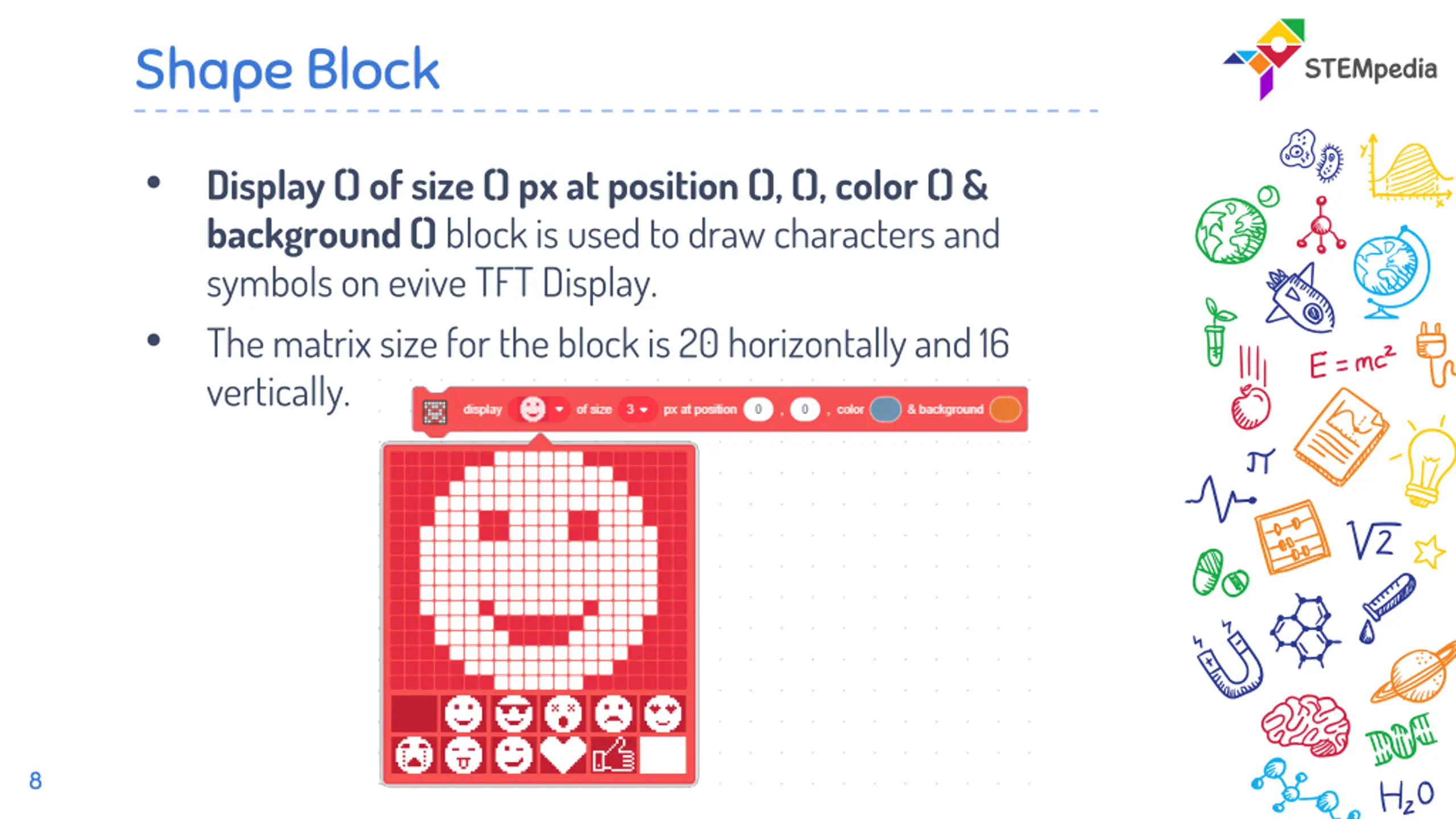 Shape Block Display () of size () px at position (), (), color () & background () block is used to draw characters and symbols on evive TFT Display. The matrix size for the block is 20 horizontally and 16 vertically. 8