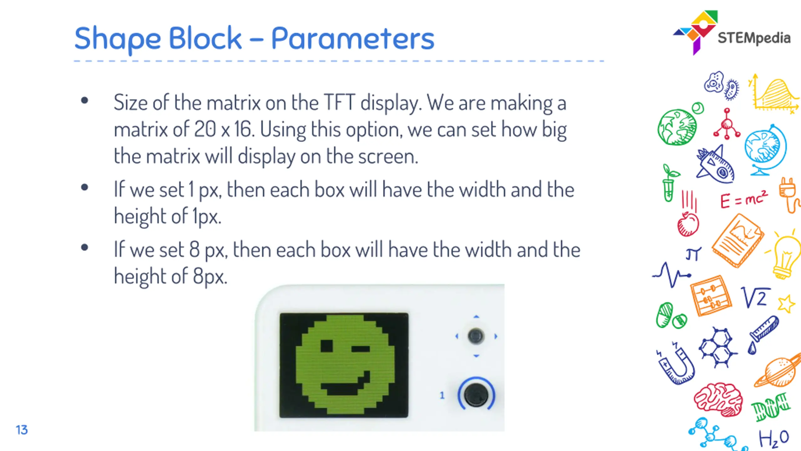 Shape Block - Parameters Size of the matrix on the TFT display. We are making a matrix of 20 x 16. Using this option, we can set how big the matrix will display on the screen. If we set 1 px, then each box will have the width and the height of 1px. If we set 8 px, then each box will have the width and the height of 8px. 13