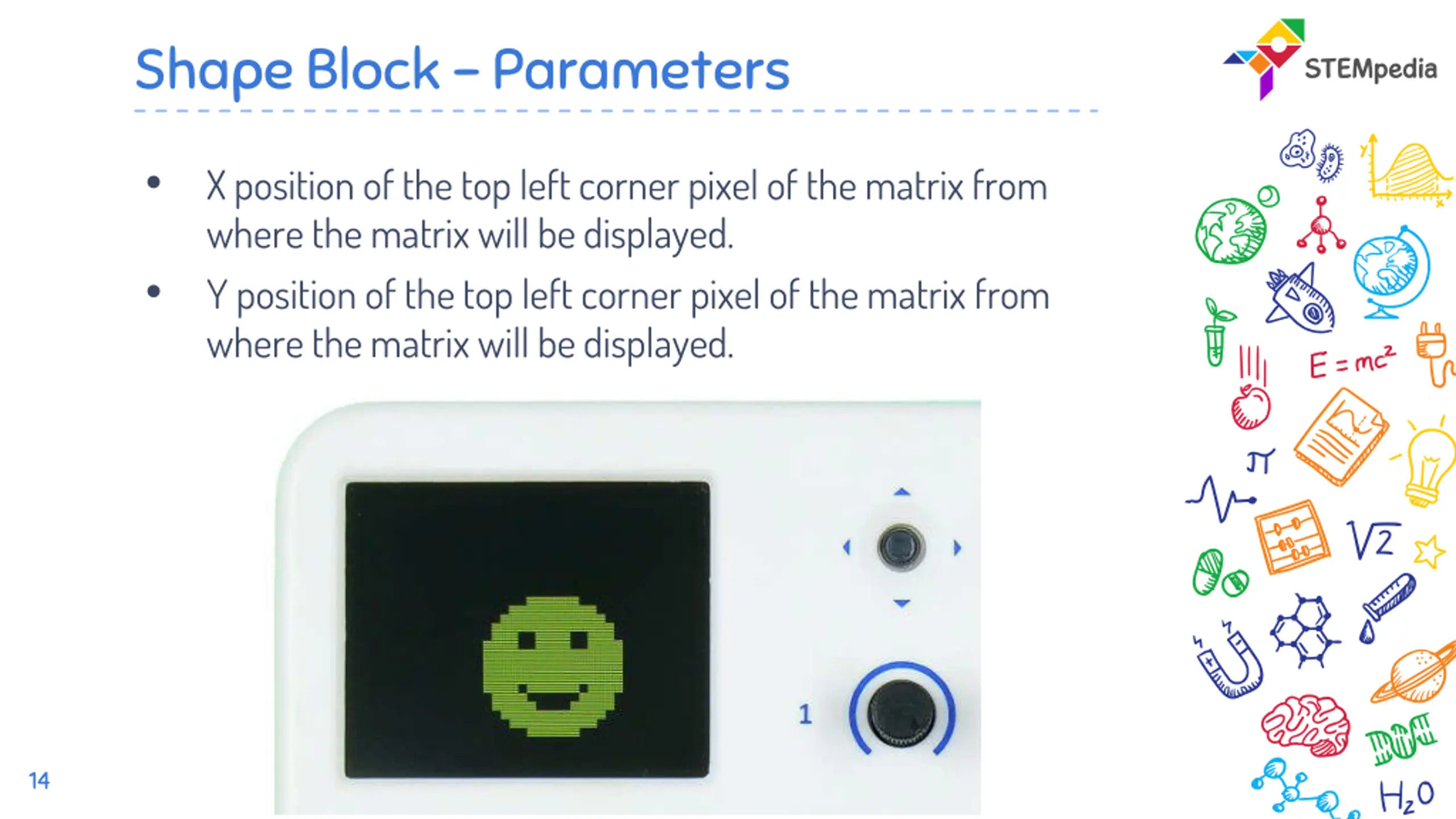 Shape Block - Parameters X position of the top left corner pixel of the matrix from where the matrix will be displayed. Y position of the top left corner pixel of the matrix from where the matrix will be displayed. 14